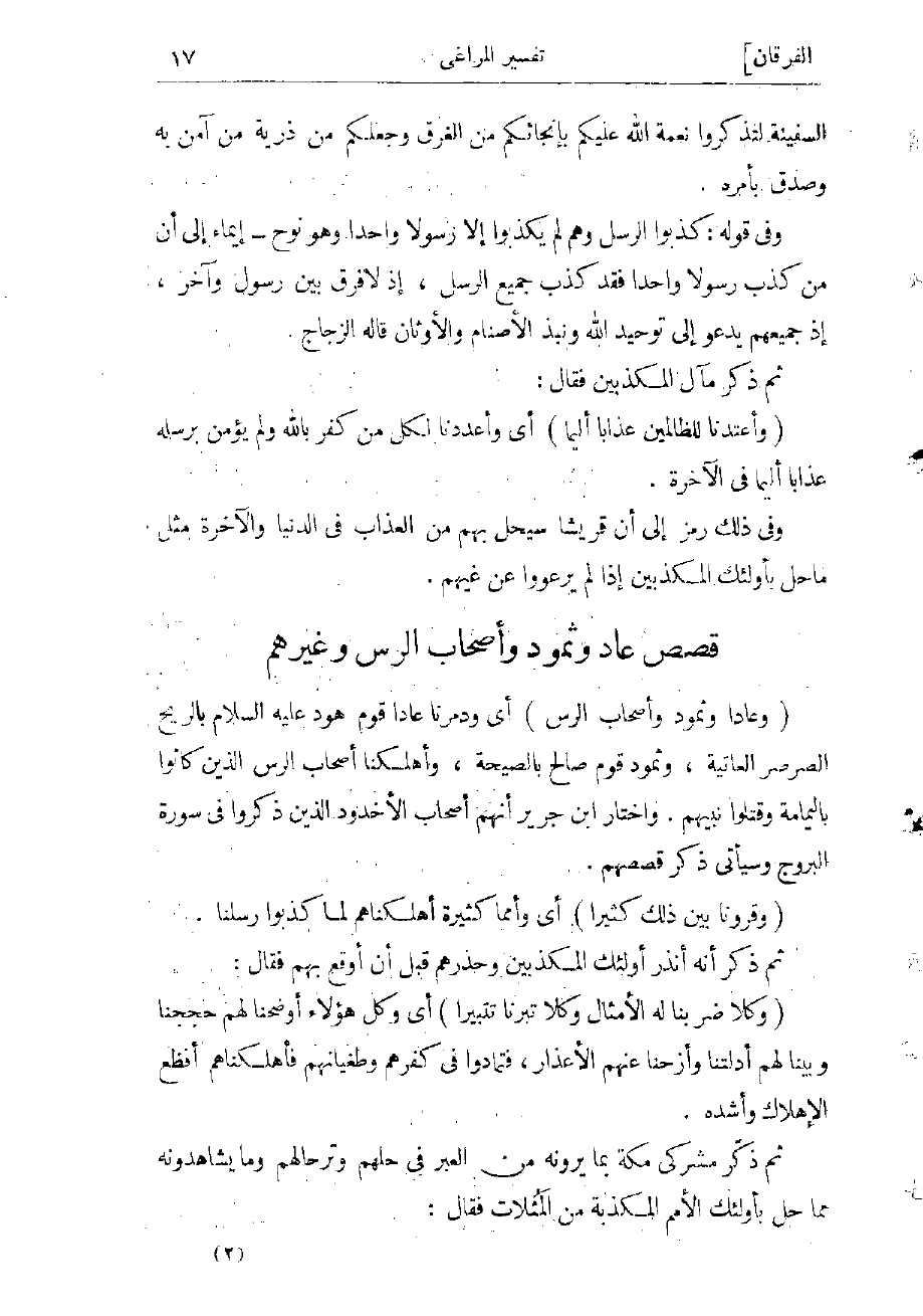 (وَعاداً وَثَمُودَ وَأَصْحابَ الرَّسِّ) أي ودمّرنا عادا قوم هود عليه السلام بالريح الصرصر العاتية، وثمود قوم صالح بالصيحة، وأهلكنا أصحاب الرس الذين كانوا باليمامة وقتلوا نبيهم. واختار ابن جرير أنهم أصحاب الأخدود الذين ذكروا فى سورة البروج وسيأتى ذكر قصصهم.