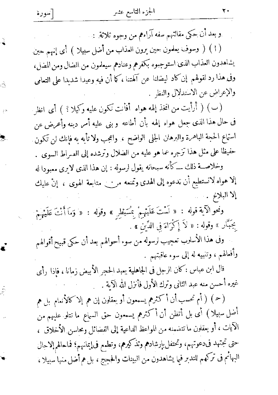(ح) (أَمْ تَحْسَبُ أَنَّ أَكْثَرَهُمْ يَسْمَعُونَ أَوْ يَعْقِلُونَ إِنْ هُمْ إِلَّا كَالْأَنْعامِ بَلْ هُمْ أَضَلُّ سَبِيلًا) أي بل أتظن أن أكثرهم يسمعون حق السماع ما تتلو عليهم من الآيات، أو يعقلون ما تتضمنه من المواعظ الداعية إلى الفضائل ومحاسن الأخلاق، حتى تجتهد فى دعوتهم، وتحتفل بإرشادهم وتذكيرهم، وتطمع فى إيمانهم فما حالهم إلا حال البهائم فى تركهم للتدبر فيما يشاهدون من البينات والحجج، بل هم أضل منها سبيلا،