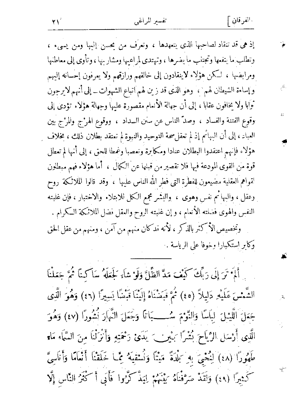 هى قد تنقاد لصاحبها الذي يتعهّدها، وتعرف من يحسن إليها ومن يسىء، وتطلب ما ينفعها وتجتنب ما يضرها، وتهتدى لمراعيها ومشاربها، وتأوى إلى معاطنها ومرابضها، لكن هؤلاء لا ينقادون لخالقهم ورازقهم، ولا يعرفون إحسانه إليهم وإساءة الشيطان لهم، وهو الذي قد زين لهم اتباع الشهوات- إلى أنهم لا يرجون ثوابا، ولا يخافون عقابا، إلى أن جهالة الأنعام مقصورة عليها، وجهالة هؤلاء تؤدى إلى وقوع الفتنة والفساد، وصدّ الناس عن سنن السّداد، ووقوع الهرج والمرج بين العباد، إلى أن البهائم إذ لم تعقل صحة التوحيد والنبوة لم تعتقد بطلان ذلك، بخلاف هؤلاء فإنهم اعتقدوا البطلان عنادا ومكابرة وتعصبا وغمطا للحق، إلى أنها لم تعطّل قوة من القوى المودعة فيها، فلا تقصير من قبلها عن الكمال، أما هؤلاء فهم مبطلون لقواهم العقلية مضيعون للفطرة التي فطر الله الناس عليها، وقد قالوا الملائكة روح وعقل، والبهائم نفس وهوى، والبشر مجمع الكل للابتلاء والاختبار، فإن غلبته النفس والهوى فضلته الأنعام، وإن غلبته الروح والعقل فضل الملائكة الكرام.