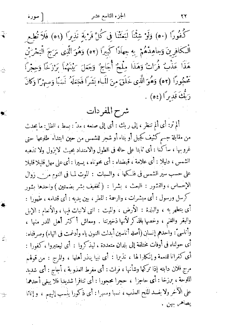 أي نبيا ينذر أهلها، والمرج: من قولهم مرج فلان دابته إذا تركها وشأنها، فرات: أي مفرط العذوبة، أجاج: أي شديد الملوحة، برزخا: أي حاجزا، حجرا محجورا: أي تنافرا شديدا فلا يبغى أحدهما على الآخر ولا يفسد الملح العذب، نسبا وصهرا: أي ذكورا ينسب إليهم، وإناثا يصاهر بهن.