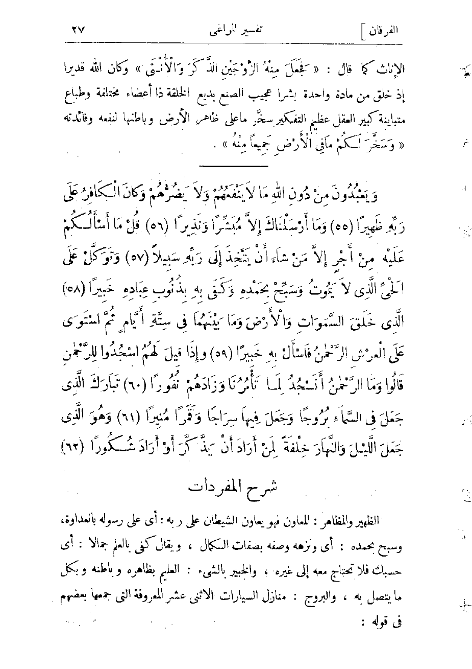 الظهير والمظاهر: المعاون فهو يعاون الشيطان على ربه: أي على رسوله بالعداوة، وسبح بحمده: أي ونزّهه وصفه بصفات الكمال، ويقال كفى بالعلم جمالا: أي حسبك، فلا تحتاج معه إلى غيره، والخبير بالشيء: العليم بظاهره وباطنه وبكل ما يتصل به، والبروج: منازل السيارات الاثني عشر المعروفة التي جمعها بعضهم فى قوله: