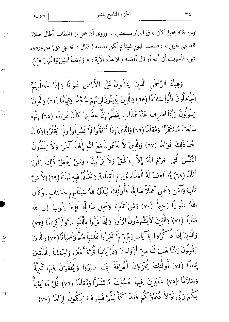 وَعِبادُ الرَّحْمنِ الَّذِينَ يَمْشُونَ عَلَى الْأَرْضِ هَوْناً وَإِذا خاطَبَهُمُ الْجاهِلُونَ قالُوا سَلاماً (63) وَالَّذِينَ يَبِيتُونَ لِرَبِّهِمْ سُجَّداً وَقِياماً (64) وَالَّذِينَ يَقُولُونَ رَبَّنَا اصْرِفْ عَنَّا عَذابَ جَهَنَّمَ إِنَّ عَذابَها كانَ غَراماً (65) إِنَّها ساءَتْ مُسْتَقَرًّا وَمُقاماً (66) وَالَّذِينَ إِذا أَنْفَقُوا لَمْ يُسْرِفُوا وَلَمْ يَقْتُرُوا وَكانَ بَيْنَ ذلِكَ قَواماً (67)