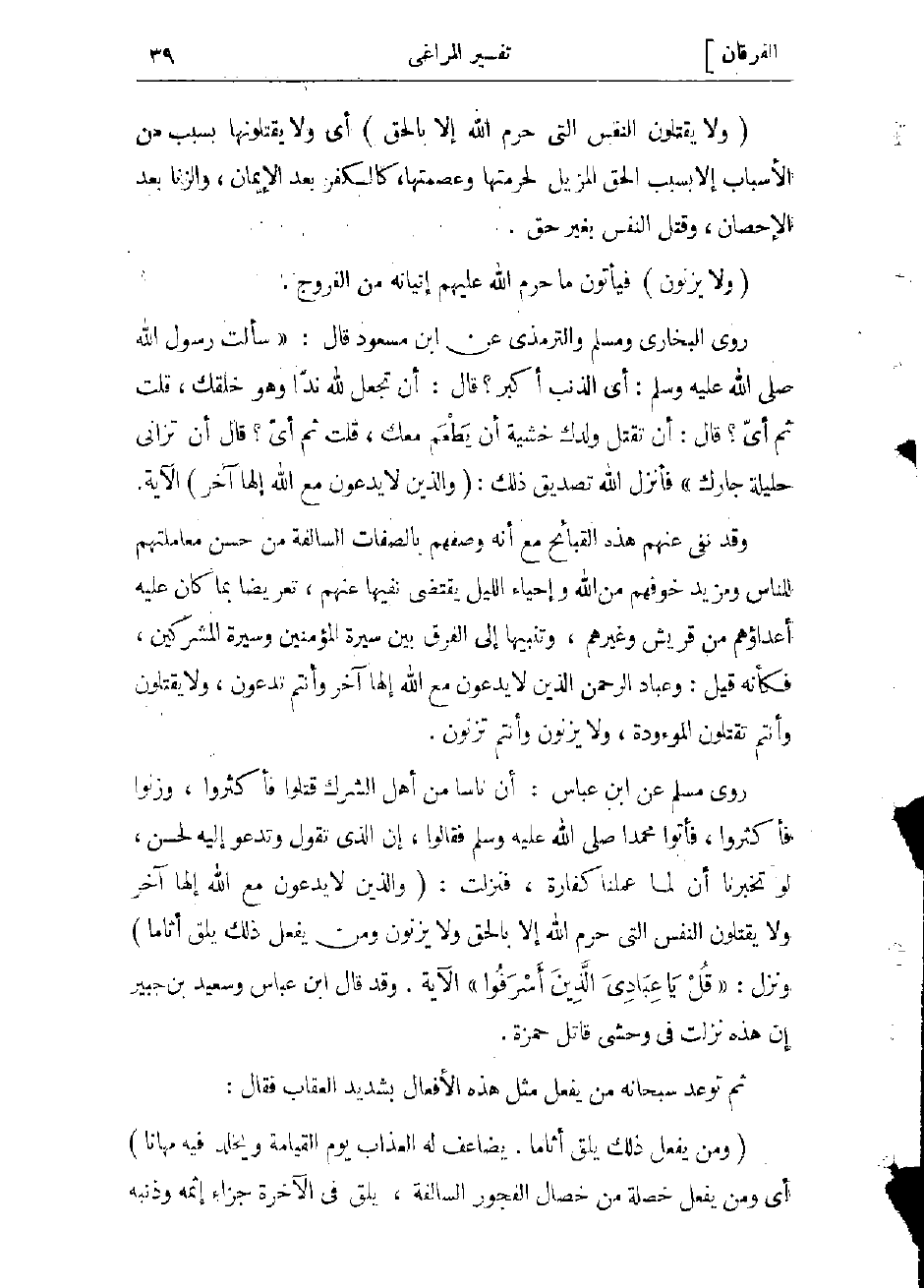 قال: أن تقتل ولدك خشية أن يطعم معك، قلت ثم أىّ؟ قال أن تزانى حليلة جارك» فأنزل الله تصديق ذلك: (وَالَّذِينَ لا يَدْعُونَ مَعَ اللَّهِ إِلهاً آخَرَ) الآية.
