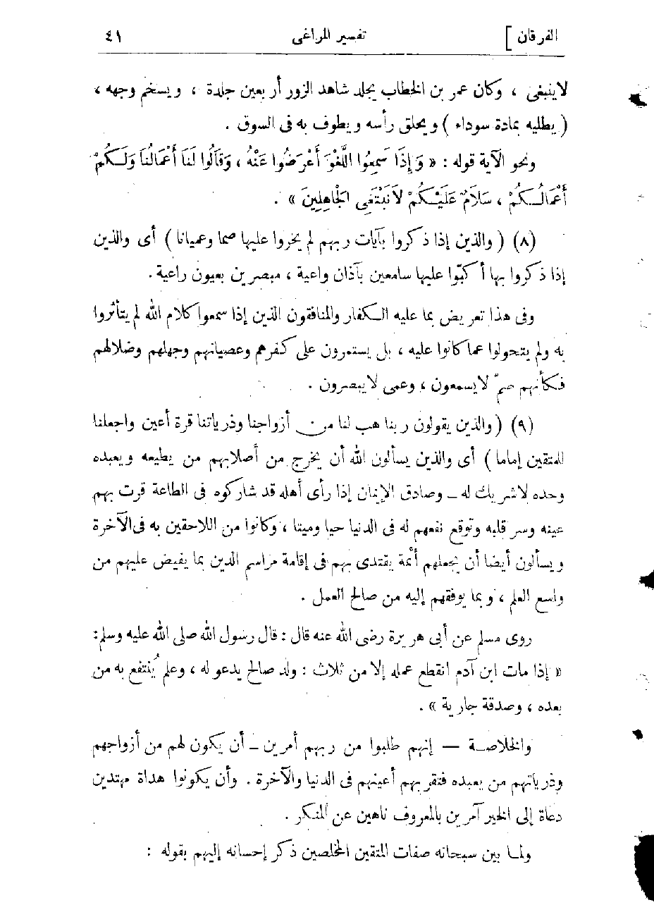 (9) (وَالَّذِينَ يَقُولُونَ رَبَّنا هَبْ لَنا مِنْ أَزْواجِنا وَذُرِّيَّاتِنا قُرَّةَ أَعْيُنٍ وَاجْعَلْنا لِلْمُتَّقِينَ إِماماً) أي والذين يسألون الله أن يخرج من أصلابهم من يطيعه ويعبده وحده لا شريك له- وصادق الإيمان إذا رأى أهله قد شاركوه فى الطاعة قرت بهم عينه، وسر قلبه، وتوقّع نفعهم له فى الدنيا حيا وميتا، وكانوا من اللاحقين به فى الآخرة ويسألون أيضا أن يجعلهم أئمة يقتدى بهم فى إقامة مراسم الدين بما يفيض عليهم من واسع العلم، وبما يوفقهم إليه من صالح العمل.