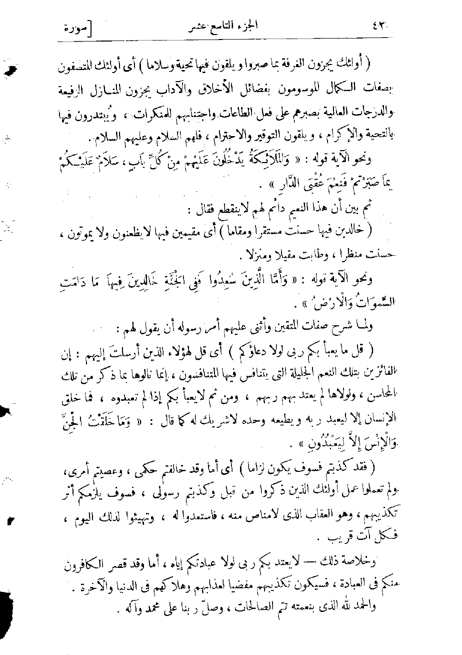 (قُلْ ما يَعْبَؤُا بِكُمْ رَبِّي لَوْلا دُعاؤُكُمْ) أي قل لهؤلاء الذين أرسلت إليهم: إن الفائزين بتلك النعم الجليلة التي يتنافس فيها المتنافسون، إنما نالوها بما ذكر من تلك المحاسن، ولولاها لم يعتد بهم ربهم، ومن ثم لا يعبأبكم إذا لم تعبدوه، فما خلق الإنسان إلا ليعبد ربه ويطيعه وحده لا شريك له كما قال: «وَما خَلَقْتُ الْجِنَّ وَالْإِنْسَ إِلَّا لِيَعْبُدُونِ» .