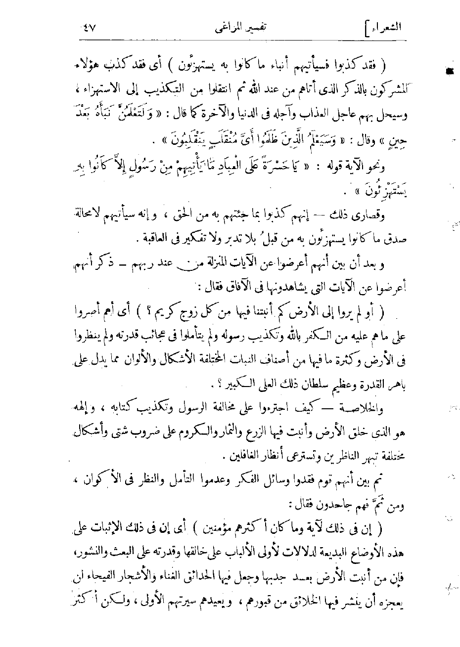 (إِنَّ فِي ذلِكَ لَآيَةً وَما كانَ أَكْثَرُهُمْ مُؤْمِنِينَ) أي إن فى ذلك الإنبات على هذه الأوضاع البديعة لدلالات لأولى الألباب على قدرة خالقه على البعث والنشور، فإن من أنبت الأرض بعد جدبها وجعل فيها الحدائق الغناء والأشجار الفيحاء لن يعجزه أن ينشر فيها الخلائق من قبورهم، ويعيدهم سيرتهم الأولى، ولكن أكثر الناس غفلوا