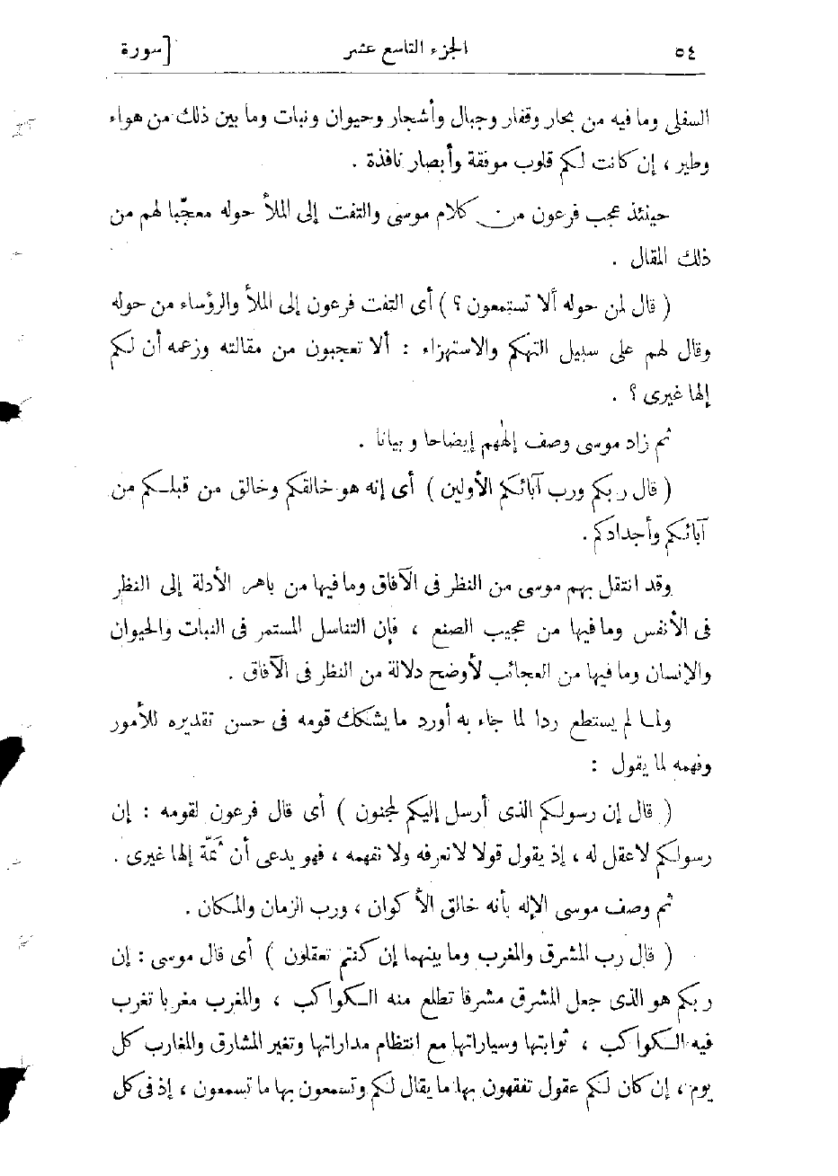 وقد انتقل بهم موسى من النظر فى الآفاق وما فيها من باهر الأدلة إلى النظر فى الأنفس وما فيها من عجيب الصنع، فإن التناسل المستمر فى النبات والحيوان والإنسان وما فيها من العجائب لأوضح دلالة من النظر فى الآفاق.