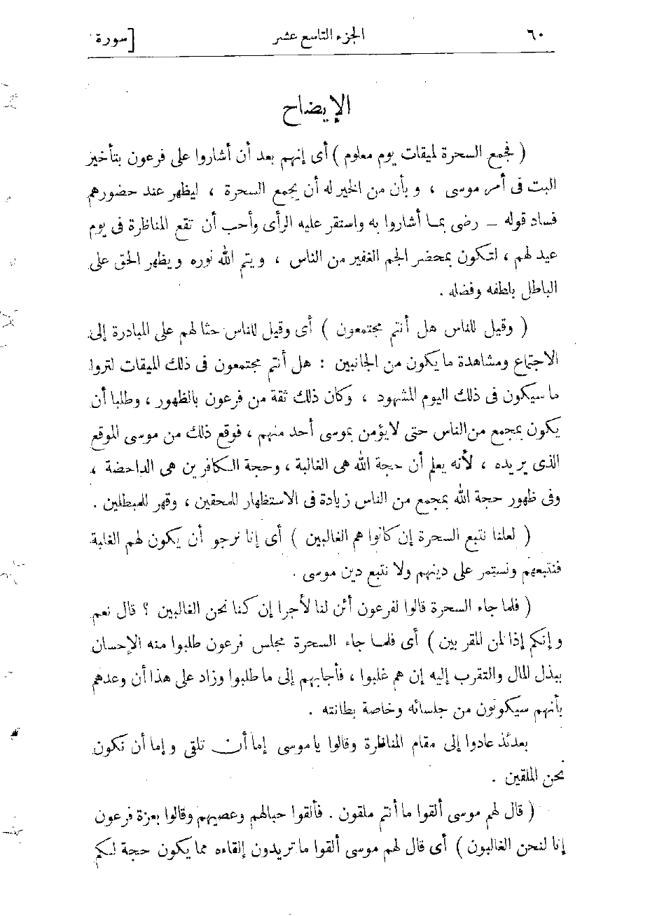 (قالَ لَهُمْ مُوسى أَلْقُوا ما أَنْتُمْ مُلْقُونَ. فَأَلْقَوْا حِبالَهُمْ وَعِصِيَّهُمْ وَقالُوا بِعِزَّةِ فِرْعَوْنَ إِنَّا لَنَحْنُ الْغالِبُونَ) أي قال لهم موسى ألقوا ما تريدون إلقاءه، مما يكون حجة لكم