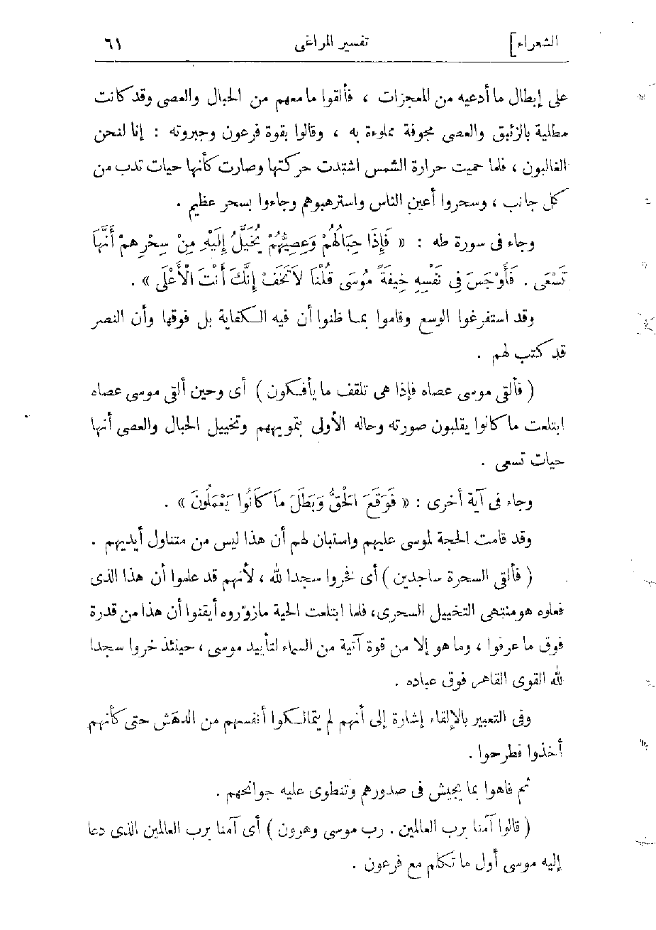 وجاء فى سورة طه: «فَإِذا حِبالُهُمْ وَعِصِيُّهُمْ يُخَيَّلُ إِلَيْهِ مِنْ سِحْرِهِمْ أَنَّها تَسْعى فَأَوْجَسَ فِي نَفْسِهِ خِيفَةً مُوسى قُلْنا لا تَخَفْ إِنَّكَ أَنْتَ الْأَعْلى» .