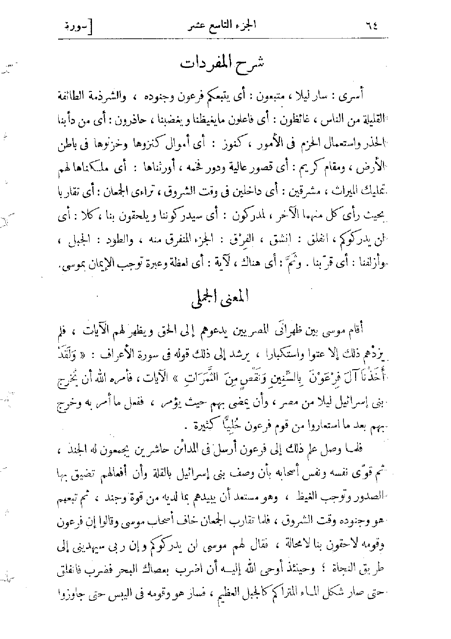 أسرى: سار ليلا، متبعون: أي يتبعكم فرعون وجنوده، والشرذمة: الطائفة القليلة من الناس، غائظون: أي فاعلون ما يغيظنا ويغضبنا، حاذرون: أي من دأبنا الحذر واستعمال الحزم فى الأمور، كنوز: أي أموال كنزوها وخزنوها فى باطن الأرض، ومقام كريم: أي قصور عالية ودور فخمة، أورثناها: أي ملكناها لهم تمليك الميراث، مشرقين: أي داخلين فى وقت الشروق، تراءى الجمعان: أي تقاربا بحيث رأى كل منهما الآخر، لمدركون: أي سيدر كوننا ويلحقون بنا، كلا: أي لن يدركوكم، انفلق: انشق، الفرق: الجزء المنفرق منه، والطود: الجبل، وأزلفنا: