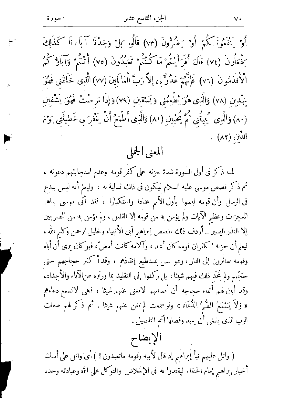 لما ذكر فى أول السورة شدة حزنه صلى الله عليه وسلم على كفر قومه وعدم استجابتهم دعوته، ثم ذكر قصص موسى عليه السلام ليكون فى ذلك تسلية له، وليعلم أنه ليس ببدع فى الرسل، وأن قومه ليسوا بأول الأمم عنادا واستكبارا، فقد أتى موسى بباهر المعجزات، وعظيم الآيات، ولم يؤمن به من قومه إلا القليل، ولم يؤمن به من المصريين إلا النذر اليسير- أردف ذلك بقصص إبراهيم أبى الأنبياء، وخليل الرحمن، وكليم الله، ليعلم أن حزنه لكفران قومه كان أشد، وآلامه كانت أمض، فهو كان يرى أن أباه وقومه صائرون إلى النار، وهو ليس بمستطيع إنقاذهم، وقد أكثر حجاجهم حتى حجّهم ولم يجد ذلك فيهم شيئا، بل ركنوا إلى التقليد بما ورثوه عن الآباء والأجداد، وقد أبان لهم أثناء حجاجه أن أصنامهم لا تغنى عنهم شيئا، فهى لا تسمع دعاءهم «وَلا يَسْمَعُ الصُّمُّ الدُّعاءَ» ولو سمعت لم تغن عنهم شيئا. ثم ذكر لهم صفات الرّب الذي ينبغى أن يعبد وفصلها أتم التفصيل.