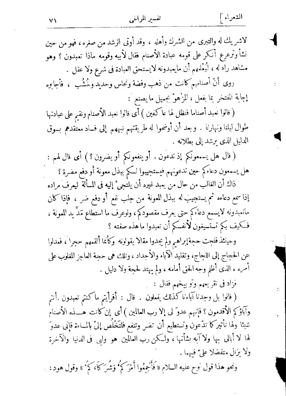 (قالُوا بَلْ وَجَدْنا آباءَنا كَذلِكَ يَفْعَلُونَ. قالَ: أَفَرَأَيْتُمْ ما كُنْتُمْ تَعْبُدُونَ. أَنْتُمْ وَآباؤُكُمُ الْأَقْدَمُونَ؟ فَإِنَّهُمْ عَدُوٌّ لِي إِلَّا رَبَّ الْعالَمِينَ) أي إن كانت هذه الأصنام شيئا ولها تأثير كما تدّعون، وتستطيع أن تضر وتنفع فلتخلص إلىّ بالمساءة فإنى عدوّ لها، لا أبالى بها ولا آبه بشأنها، ولكن رب العالمين هو ولى فى الدنيا والآخرة، ولا يزال متفضلا علىّ فيهما.