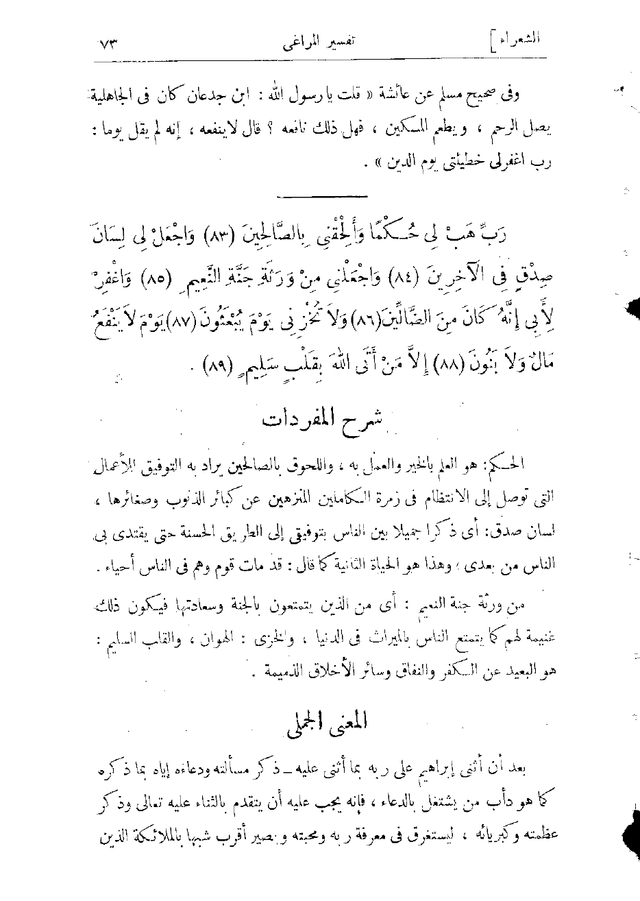 الحكم: هو العلم بالخير والعمل به، واللحوق بالصالحين يراد به التوفيق للأعمال التي توصل إلى الانتظام فى زمرة الكاملين المنزهين عن كبائر الذنوب وصغائرها، لسان صدق: أي ذكرا جميلا بين الناس بتوفيقى إلى الطريق الحسنة حتى يقتدى بي الناس من بعدي، وهذا هو الحياة الثانية كما قال: قد مات قوم وهم فى الناس أحياء، من ورثة جنة النعيم: أي من الذين يتمتعون بالجنة وسعادتها فيكون ذلك غنيمة لهم كما يتمتع الناس بالميراث فى الدنيا، والخزي: الهوان، والقلب السليم: هو البعيد عن الكفر والنفاق وسائر الأخلاق الذميمة.