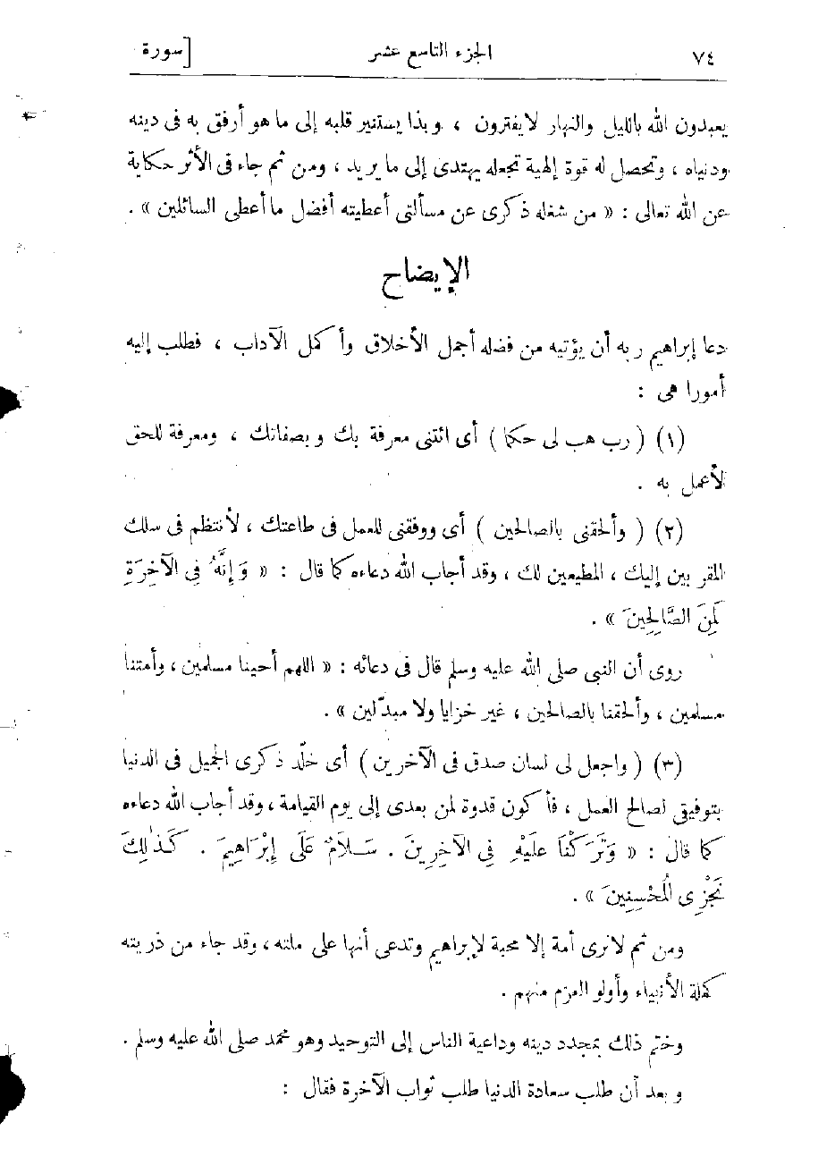 (3) (وَاجْعَلْ لِي لِسانَ صِدْقٍ فِي الْآخِرِينَ) أي وخلّد ذكرى الجميل فى الدنيا بتوفيقى لصالح العمل، فأكون قدوة لمن بعدي إلى يوم القيامة، وقد أجاب الله دعاءه كما قال: «وَتَرَكْنا عَلَيْهِ فِي الْآخِرِينَ. سَلامٌ عَلى إِبْراهِيمَ. كَذلِكَ نَجْزِي الْمُحْسِنِينَ» .