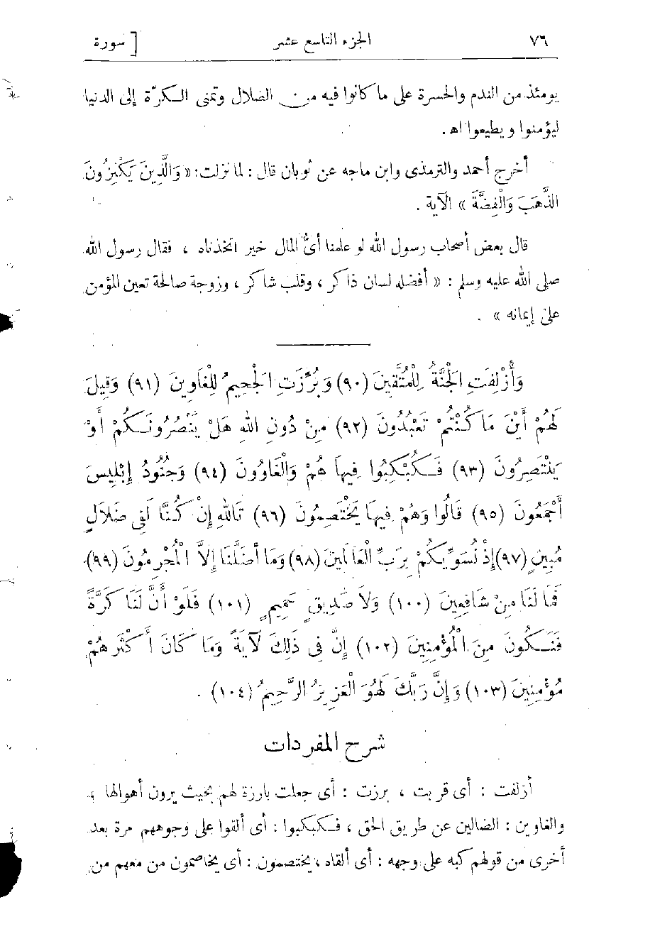 أزلفت: أي قرّبت، برزت: أي جعلت بارزة لهم بحيث يرون أهوالها، والغاوين: الضالين عن طريق الحق، فكبكبوا: أي ألقوا على وجوههم مرة بعد أخرى من قولهم كبّه على وجهه: أي ألقاه، يختصمون: أي يخاصمون من معهم من الأصنام والشياطين، نسويكم: أي نجعلكم مساوين له فى استحقاق العبادة، والصديق: