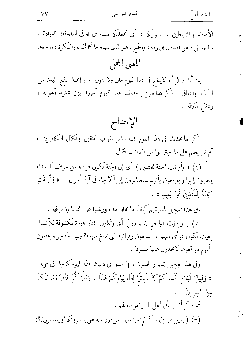 (2) (وَبُرِّزَتِ الْجَحِيمُ لِلْغاوِينَ) أي وتكون النار بارزة مكشوفة للأشقياء، بحيث تكون بمرأى منهم، يسمعون زفراتها التي تبلغ منها القلوب الحناجر، ويوقنون بأنهم مواقعوها، لا يجدون عنها مصرفا.