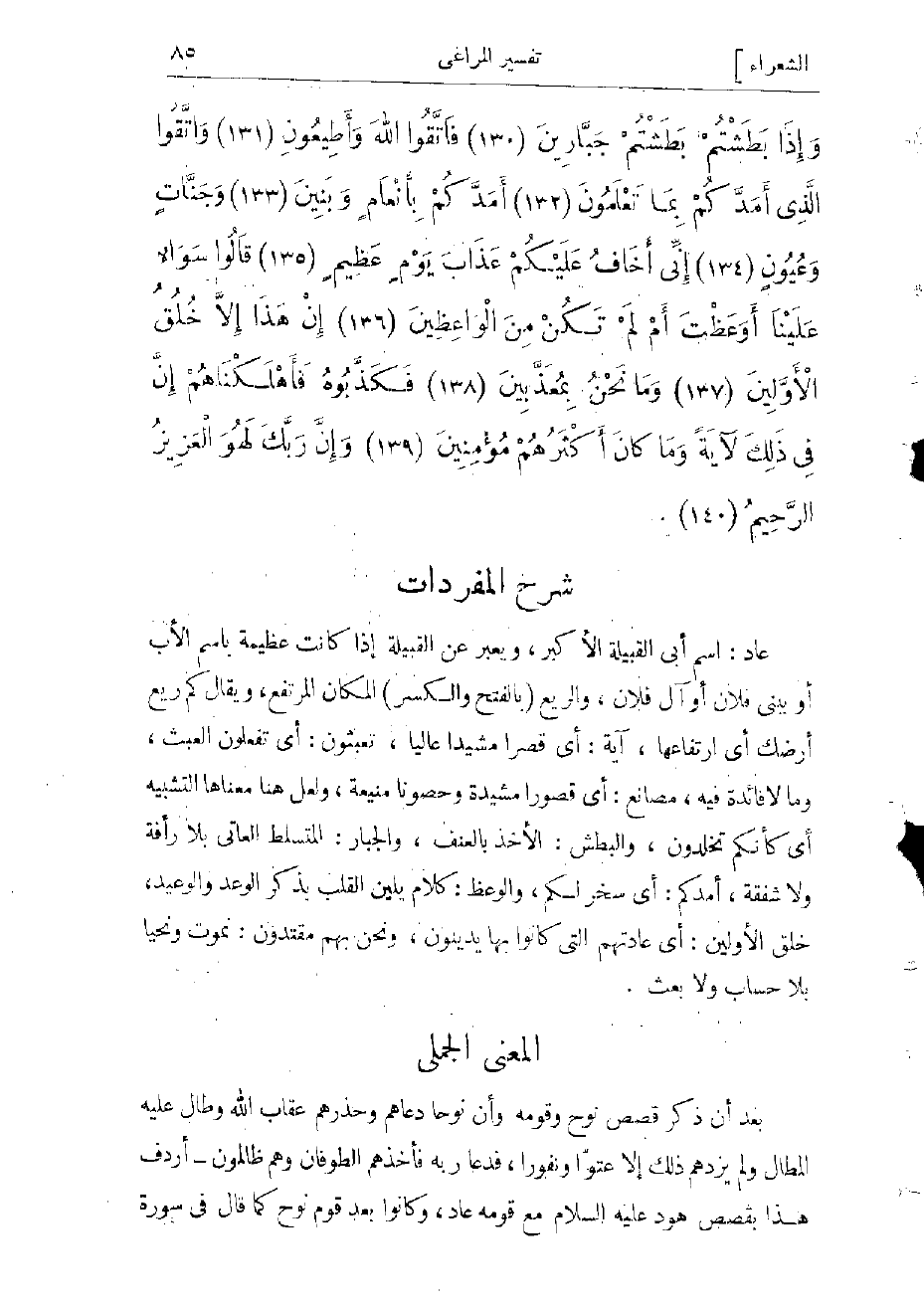 عاد: اسم أبى القبيلة الأكبر، ويعبر عن القبيلة إذا كانت عظيمة باسم الأب أو بينى فلان أو آل فلان، والريع (بالفتح والكسر) المكان المرتفع، ويقال كم ريع أرضك أي ارتفاعها، آية: أي قصرا مشيدا عاليا، تعبثون: أي تفعلون العبث، وما لا فائدة فيه، مصانع: أي قصورا مشيدة وحصونا منيعة، ولعل هنا معناها التشبيه أي كأنكم تخلدون، والبطش: الأخذ بالعنف، والجبار: المتسلط العاتي بلا رأفة ولا شفقة، أمدكم: أي سخر لكم، والوعظ: كلام يلين القلب بذكر الوعد والوعيد، خلق الأولين: أي عادتهم التي كانوا بها يدينون، ونحن بهم مقتدون: نموت ونحيا بلا حساب ولا بعث.