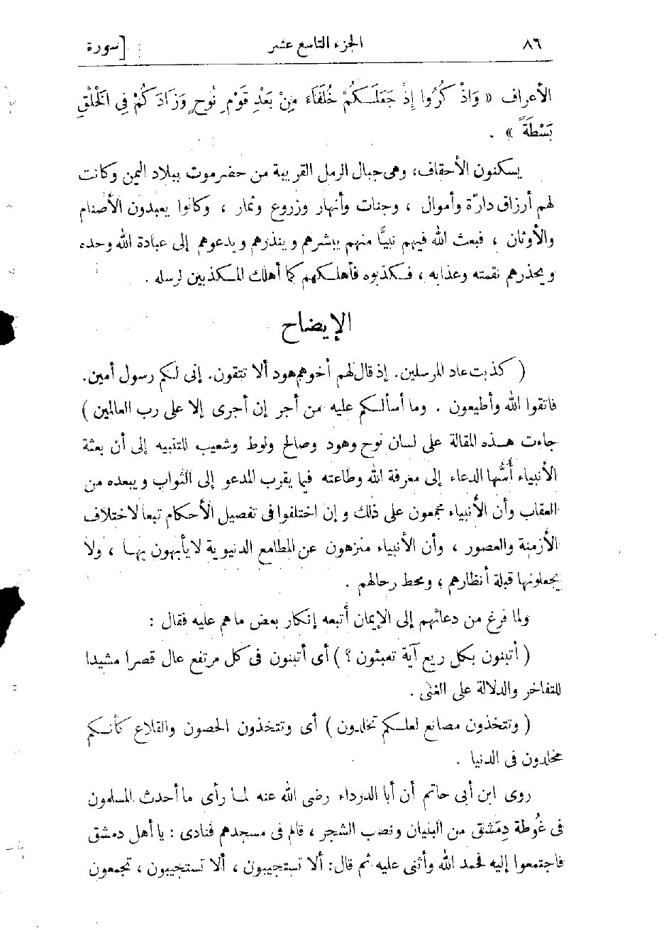 الأعراف «وَاذْكُرُوا إِذْ جَعَلَكُمْ خُلَفاءَ مِنْ بَعْدِ قَوْمِ نُوحٍ وَزادَكُمْ فِي الْخَلْقِ بَصْطَةً» . يسكنون الأحقاف، وهى جبال الرمل القريبة من حضرموت ببلاد اليمن وكانت لهم أرزاق دارّة وأموال، وجنات وأنهار وزروع وثمار، وكانوا يعبدون الأصنام والأوثان، فبعث الله فيهم نبيّا منهم يبشرهم وينذرهم ويدعوهم إلى عبادة الله وحده ويحذّرهم نقمته وعذابه، فكذبوه فأهلكهم كما أهلك المكذبين لرسله.