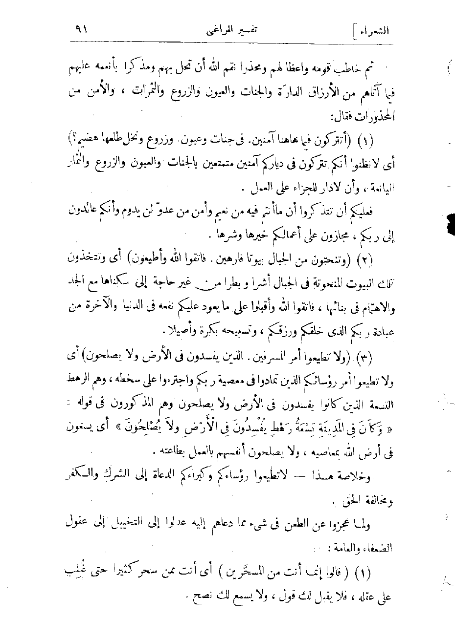(2) (وَتَنْحِتُونَ مِنَ الْجِبالِ بُيُوتاً فارِهِينَ، فَاتَّقُوا اللَّهَ وَأَطِيعُونِ) أي وتتخذون تلك البيوت المنحوتة فى الجبال أشرا وبطرا من غير حاجة إلى سكناها مع الجدّ والاهتمام فى بنائها، فاتقوا الله وأقبلوا على ما يعود عليكم نفعه فى الدنيا والآخرة من عبادة ربكم الذي خلقكم ورزقكم، وتسبيحه بكرة وأصيلا.