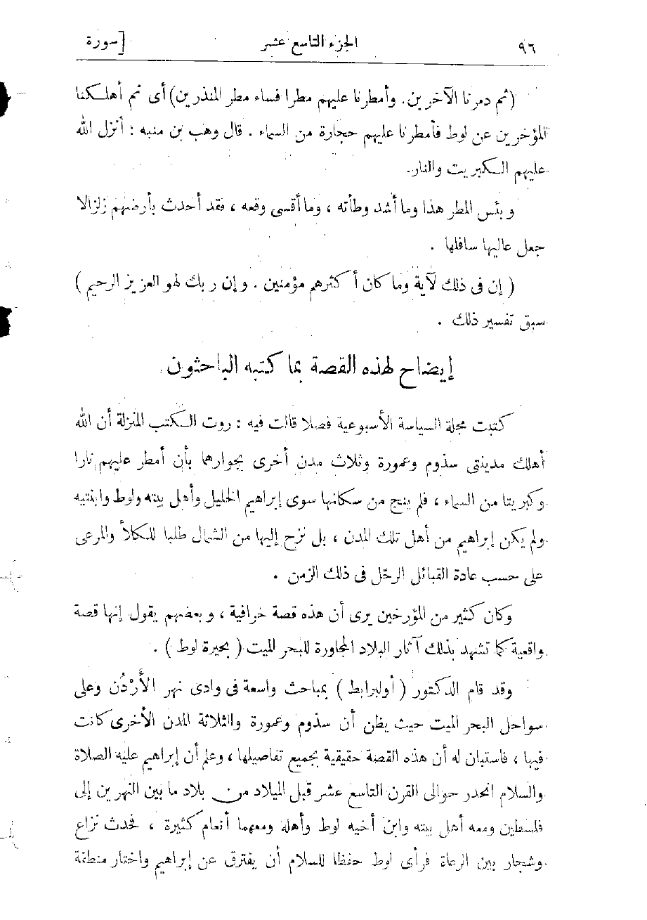 كتبت مجلة السياسية الأسبوعية فصلا قالت فيه: روت الكتب المنزلة أن الله أهلك مدينتى سذوم وعمورة وثلاث مدن أخرى بجوارهما بأن أمطر عليهم نارا وكبريتا من السماء، فلم ينج من سكانها سوى إبراهيم الخليل وأهل بيته ولوط وابنتيه ولم يكن إبراهيم من أهل تلك المدن، بل نزح إليها من الشمال طلبا للكلأ والمرعى بحسب عادة القبائل الرحّل فى ذلك الزمن.