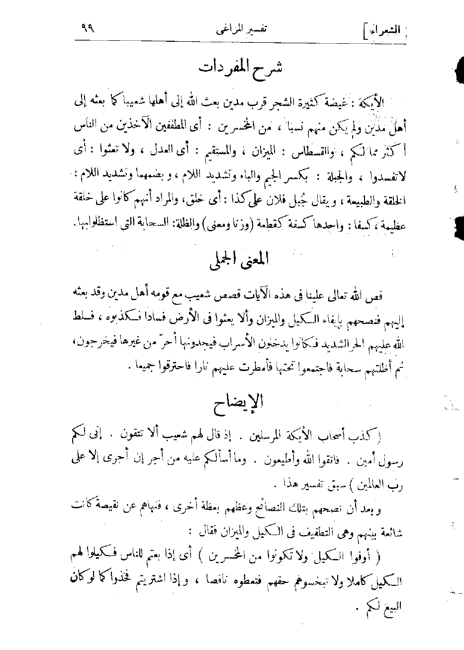 (كَذَّبَ أَصْحابُ الْأَيْكَةِ الْمُرْسَلِينَ. إِذْ قالَ لَهُمْ شُعَيْبٌ أَلا تَتَّقُونَ. إِنِّي لَكُمْ رَسُولٌ أَمِينٌ. فَاتَّقُوا اللَّهَ وَأَطِيعُونِ. وَما أَسْئَلُكُمْ عَلَيْهِ مِنْ أَجْرٍ إِنْ أَجْرِيَ إِلَّا عَلى رَبِّ الْعالَمِينَ) سبق تفسير هذا.