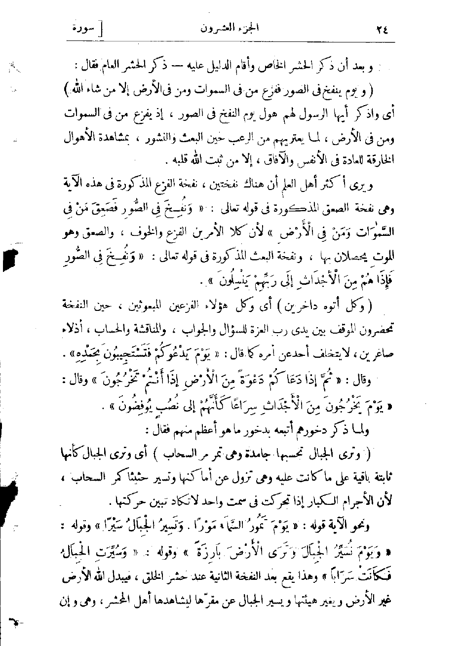 «وَيَوْمَ نُسَيِّرُ الْجِبالَ وَتَرَى الْأَرْضَ بارِزَةً» وقوله: «وَسُيِّرَتِ الْجِبالُ فَكانَتْ سَراباً» وهذا يقع بعد النفخة الثانية عند حشر الخلق، فيبدل الله الأرض غير الأرض ويغيّر هيئتها ويسيّر الجبال عن مقارّها ليشاهدها أهل المحشر، وهى وإن