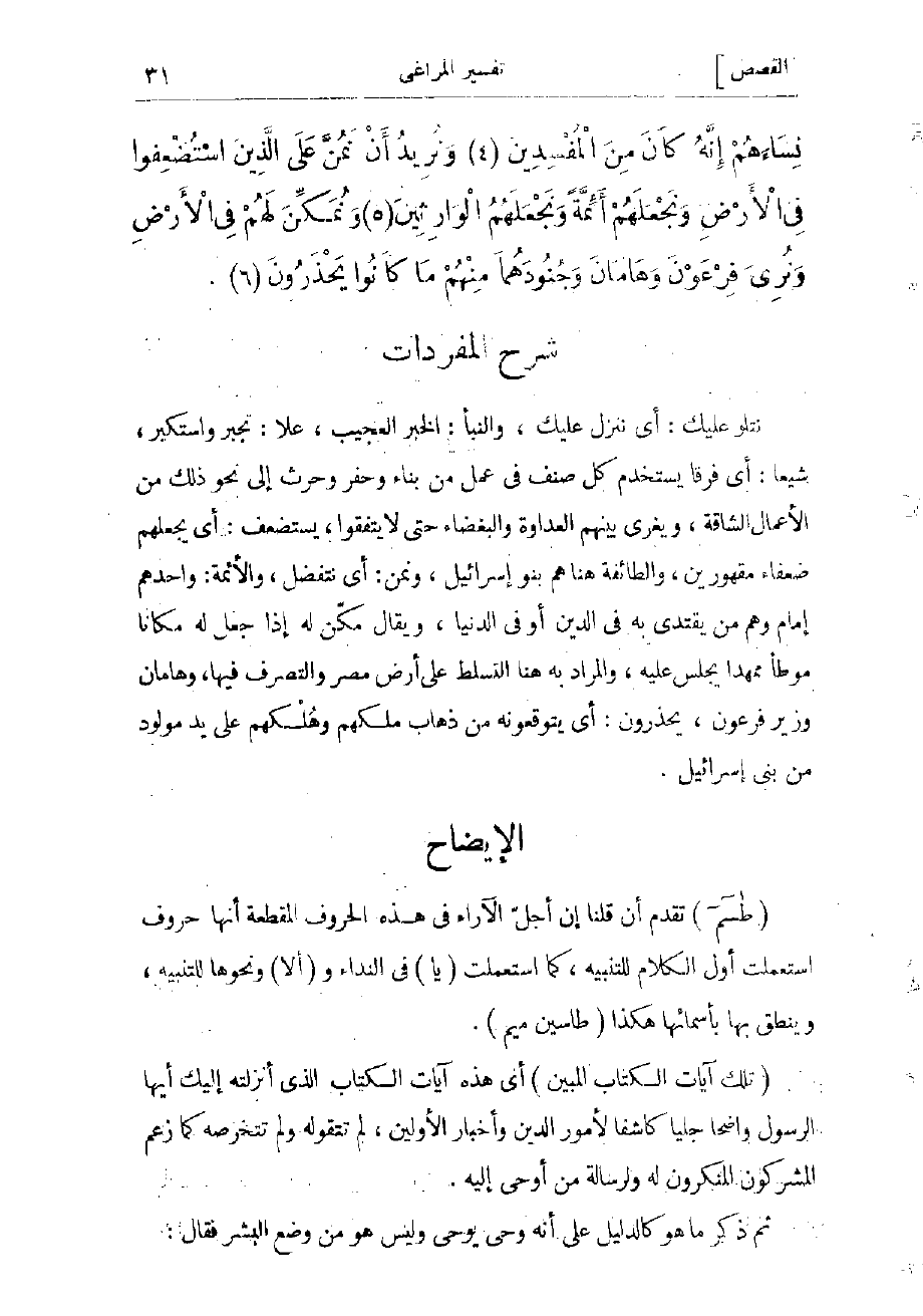نتلو عليك: أي ننزل عليك، والنبأ: الخبر العجيب، علا: تجبر واستكبر، شيعا: أي فرقا يستخدم كل صنف فى عمل من بناء وحفر وحرث إلى نحو ذلك من الأعمال الشاقة، ويغرى بينهم العداوة والبغضاء حتى لا يتفقوا، يستضعف: أي يجعلهم ضعفاء مقهورين، والطائفة هنا هم بنو إسرائيل، ونمن: أي نتفضل، والأئمة: واحدهم إمام وهو من يقتدى به فى الدين أو فى الدنيا، ويقال مكّن له إذا جعل له مكانا موطّأ ممهدا يجلس عليه، والمراد به هنا التسلط على أرض مصر والتصرف فيها، وهامان وزير فرعون، يحذرون: أي يتوقعونه من ذهاب ملكهم وهلكهم على يد مولود من بنى إسرائيل.