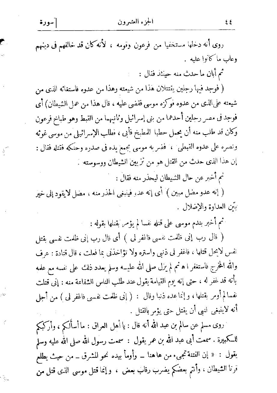 (فَوَجَدَ فِيها رَجُلَيْنِ يَقْتَتِلانِ هذا مِنْ شِيعَتِهِ وَهذا مِنْ عَدُوِّهِ فَاسْتَغاثَهُ الَّذِي مِنْ شِيعَتِهِ عَلَى الَّذِي مِنْ عَدُوِّهِ فَوَكَزَهُ مُوسى فَقَضى عَلَيْهِ، قالَ هذا مِنْ عَمَلِ الشَّيْطانِ) أي فوجد فى مصر رجلين أحدهما من بنى إسرائيل وثانيهما من القبط وهو طباخ فرعون وكان قد طلب منه أن يحمل حطبا للمطبخ فأبى، فطلب الإسرائيلى من موسى غوثه ونصره على عدوه القبطي، فضر به موسى بجمع يده فى صدره وحنكه فقتله فقال: