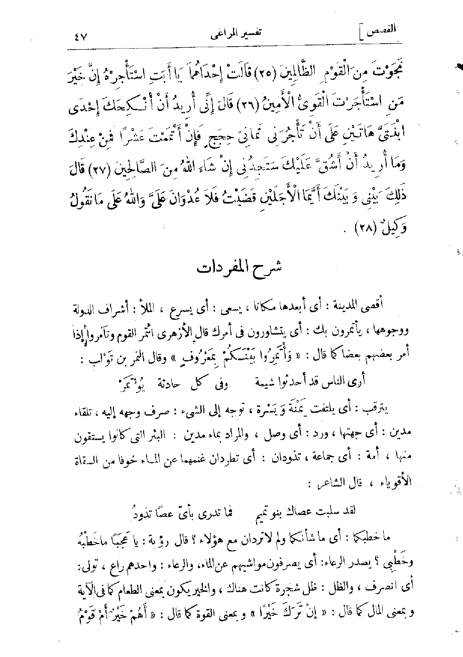 ما خطبكما: أي ما شأنكما ولم لا تردان مع هؤلاء؟ قال رؤبة يا عجبا ما خطبه وخطبى؟ يصدر الرعاء: أي يصرفون مواشيهم عن الماء، والرعاء: واحدهم راع، تولى: أي انصرف، والظل: ظل شجرة كانت هناك، والخير يكون بمعنى الطعام كما فى الآية وبمعنى المال كما قال: «إِنْ تَرَكَ خَيْراً» وبمعنى القوة كما قال: «أَهُمْ خَيْرٌ أَمْ قَوْمُ تُبَّعٍ» وبمعنى العبادة كقوله: «وَأَوْحَيْنا إِلَيْهِمْ فِعْلَ الْخَيْراتِ» فقير: أي
