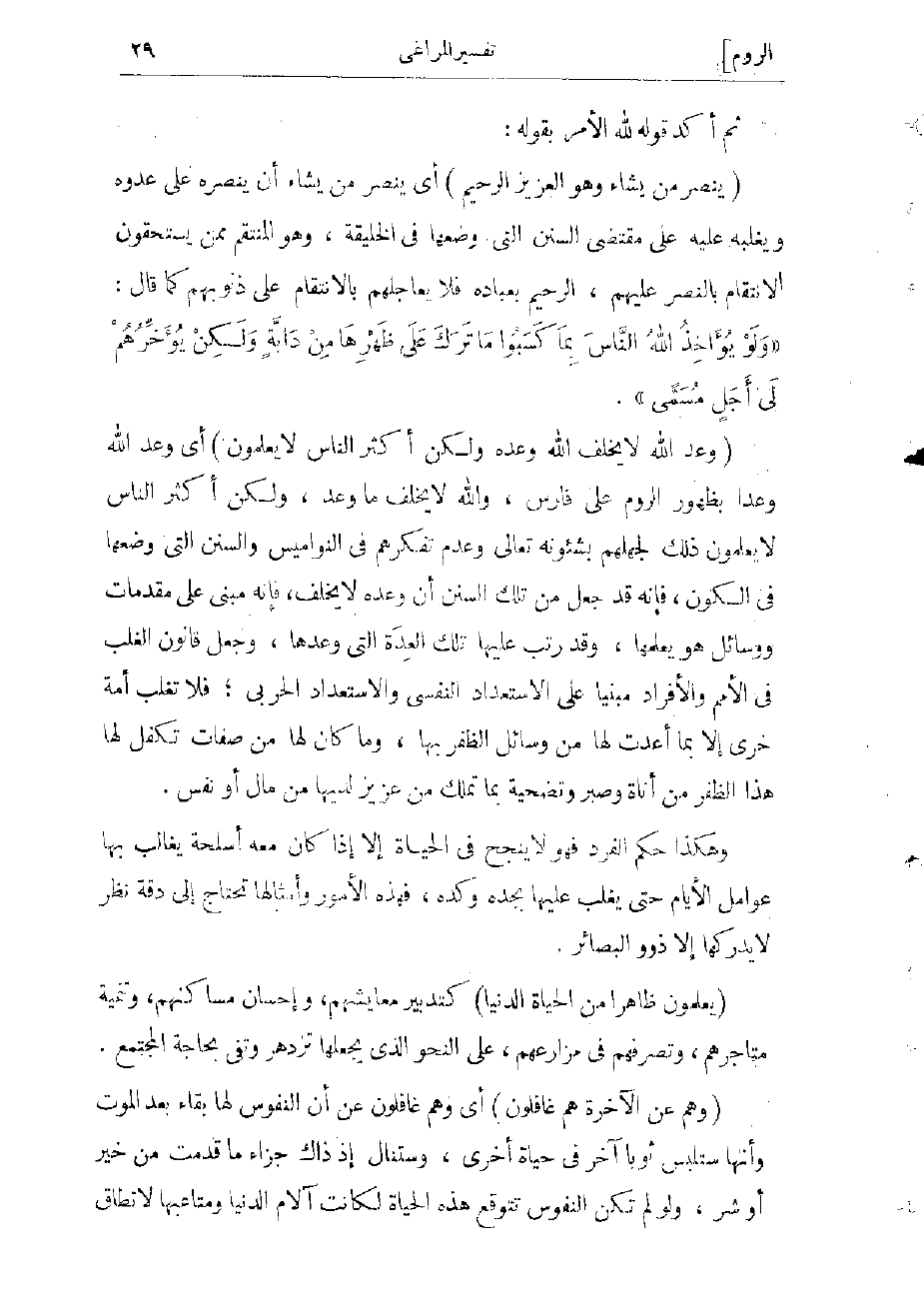 (وَعْدَ اللَّهِ لا يُخْلِفُ اللَّهُ وَعْدَهُ وَلكِنَّ أَكْثَرَ النَّاسِ لا يَعْلَمُونَ) أي وعد الله وعدا بظهور الروم على فارس، والله لا يخلف ما وعد، ولكن أكثر الناس لا يعلمون ذلك لجهلهم بشئونه تعالى وعدم تفكرهم فى النواميس والسنن التي وضعها فى الكون، فإنه قد جعل من تلك السنن أن وعده لا يخلف إذ هو مبنى على مقدمات ووسائل هو يعلمها، وقد رتب عليها تلك العدة التي وعدها، وجعل قانون الغلب فى الأمم والأفراد مبنيا على الاستعداد النفسي والاستعداد الحربي، فلا تغلب أمة أخرى إلا بما أعدت لها من وسائل الظفر بها، وما كان لها من صفات تكفل لها هذا الظفر من أناة وصبر وتضحية بما تملك من عزيز لديها من مال ونفس.