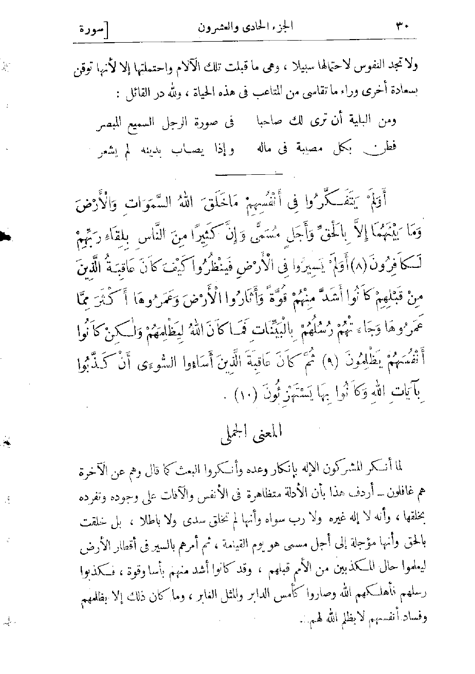 لما أنكر المشركون الإله بإنكار وعده، وأنكروا البعث كما قال وهم عن الآخرة هم غافلون- أردف هذا أن الأدلة متظاهرة فى الأنفس والآفات على وجوده وتفرده بخلقها، وأنه لا إله غيره ولا رب سواه، وأنها لم تخلق سدى ولا باطلا، بل خلقت بالحق، وأنها مؤجلة إلى أجل مسمى هو يوم القيامة، ثم أمرهم بالسير فى أقطار الأرض ليعلموا حال المكذبين من الأمم قبلهم، وقد كانوا أشد منهم بأسا وقوة، فكذبوا رسلهم فأهلكهم الله وصاروا كأمس الدابر والمثل الغابر، وما كان ذلك إلا بظلمهم وفساد أنفسهم لا بظلم الله لهم.