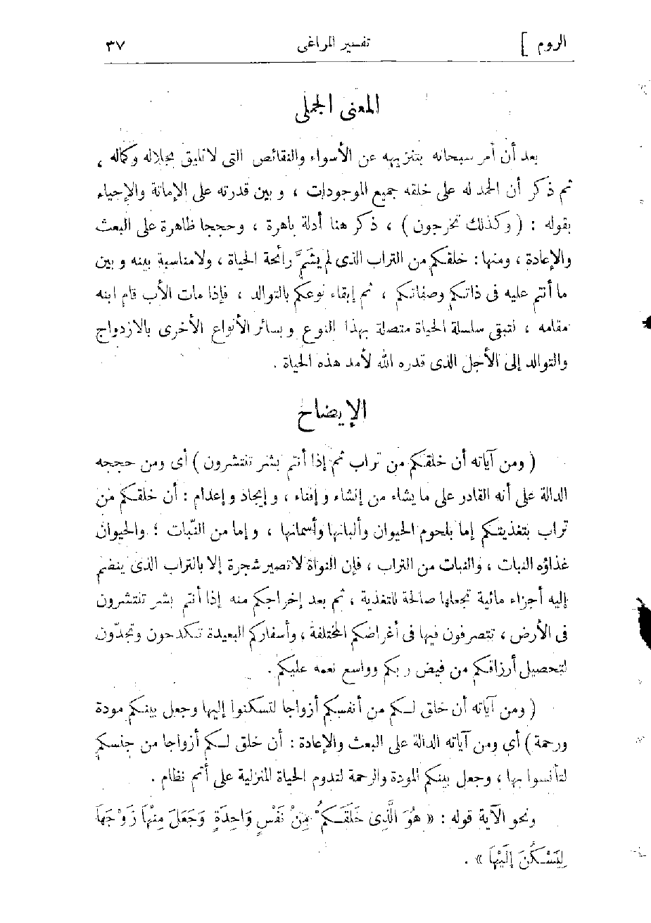 (وَمِنْ آياتِهِ أَنْ خَلَقَ لَكُمْ مِنْ أَنْفُسِكُمْ أَزْواجاً لِتَسْكُنُوا إِلَيْها وَجَعَلَ بَيْنَكُمْ مَوَدَّةً وَرَحْمَةً) أي ومن آياته الدالة على البعث والإعادة: أن خلق لكم أزواجا من جنسكم لتأنسوا بها، وجعل بينكم المودة والرحمة لتدوم الحياة المنزلية على أتم نظام.