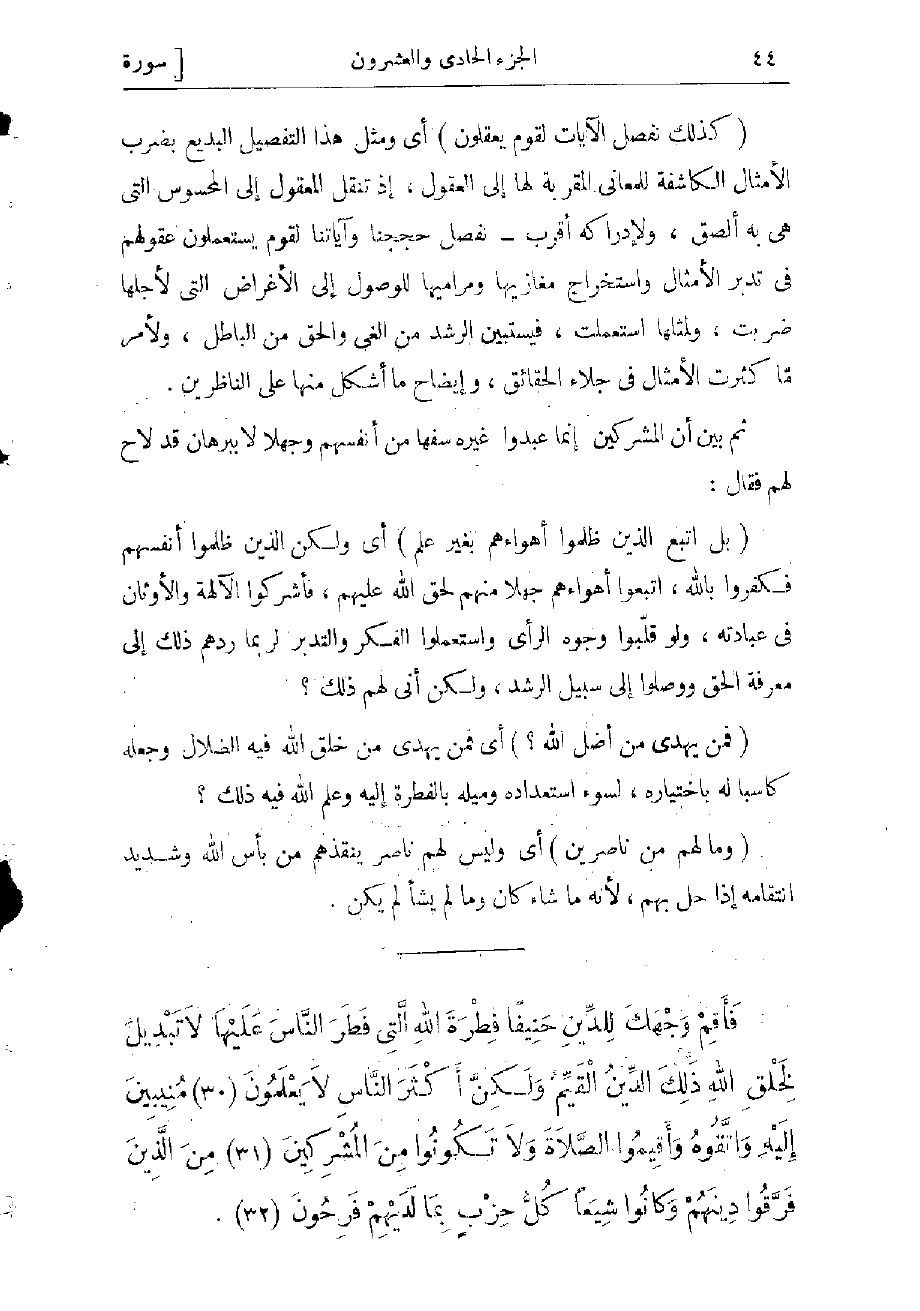 (كَذلِكَ نُفَصِّلُ الْآياتِ لِقَوْمٍ يَعْقِلُونَ) أي ومثل هذا التفصيل البديع بضرب الأمثال الكاشفة للمعانى، المقربة لها إلى العقول، إذ تنقل المعقول إلى المحسوس التي هى به ألصق، ولإداركه أقرب- نفصل حججنا وآياتنا لقوم يستعملون عقولهم فى تدبر الأمثال، واستخراج مغازيها ومراميها للوصول إلى الأغراض التي لأجلها ضربت، ولمثلها استعملت، فيستبين الرشد من الغى، والحق من الباطل، ولأمرمّا كثرت الأمثال فى جلاء الحقائق، وإيضاح ما أشكل منها على الناظرين.