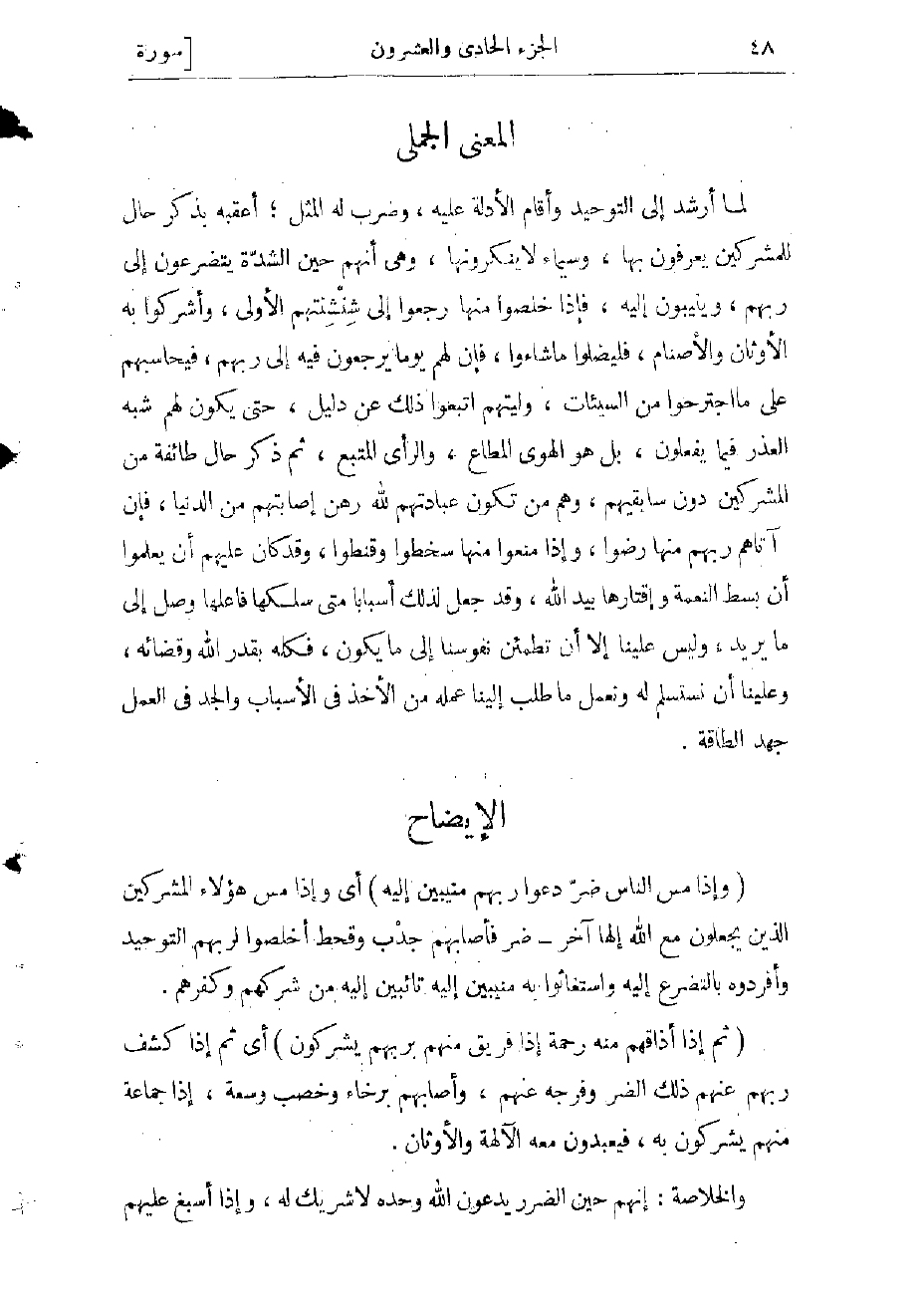 لما أرشد سبحانه إلى التوحيد، وأقام الأدلة عليه، وضرب له المثل أعقبه بذكر حال للمشركين يعرفون بها، وسيماء لا ينكرونها، وهى أنهم حين الشدّة يتضرعون إلى ربهم، وينيبون إليه، فإذا خلصوا منها رجعوا إلى شنشنتهم الأولى، وأشركوا به الأوثان والأصنام، فليضلوا ما شاءوا، فإن لهم يوما يرجعون فيه إلى ربهم، فيحاسبهم على ما اجترحوا من السيئات، وليتهم اتبعوا ذلك عن دليل، حتى يكون لهم شبه العذر فيما يفعلون، بل هو الهوى المطاع، والرأى المتّبع، ثم ذكر حال طائفة من المشركين دون سابقيهم، وهم من تكون عبادتهم لله رهن إصابتهم من الدنيا، فإن آتاهم ربهم منها رضوا، وإذا منعوا منها سخطوا وقنطوا، وقد كان عليهم أن يعلموا أن بسط النعمة وإقتارها بيده وحده، وقد جعل لذلك أسبابا متى سلكها فاعلها وصل إلى ما يريد، وليس علينا إلا أن تطمئن نفوسنا إلى ما يكون، فكله بقدر الله وقضائه، وعلينا أن نستسلم له، ونعمل ما طلب إلينا عمله من الأخذ من الأسباب والجد فى العمل جهد الطاقة.