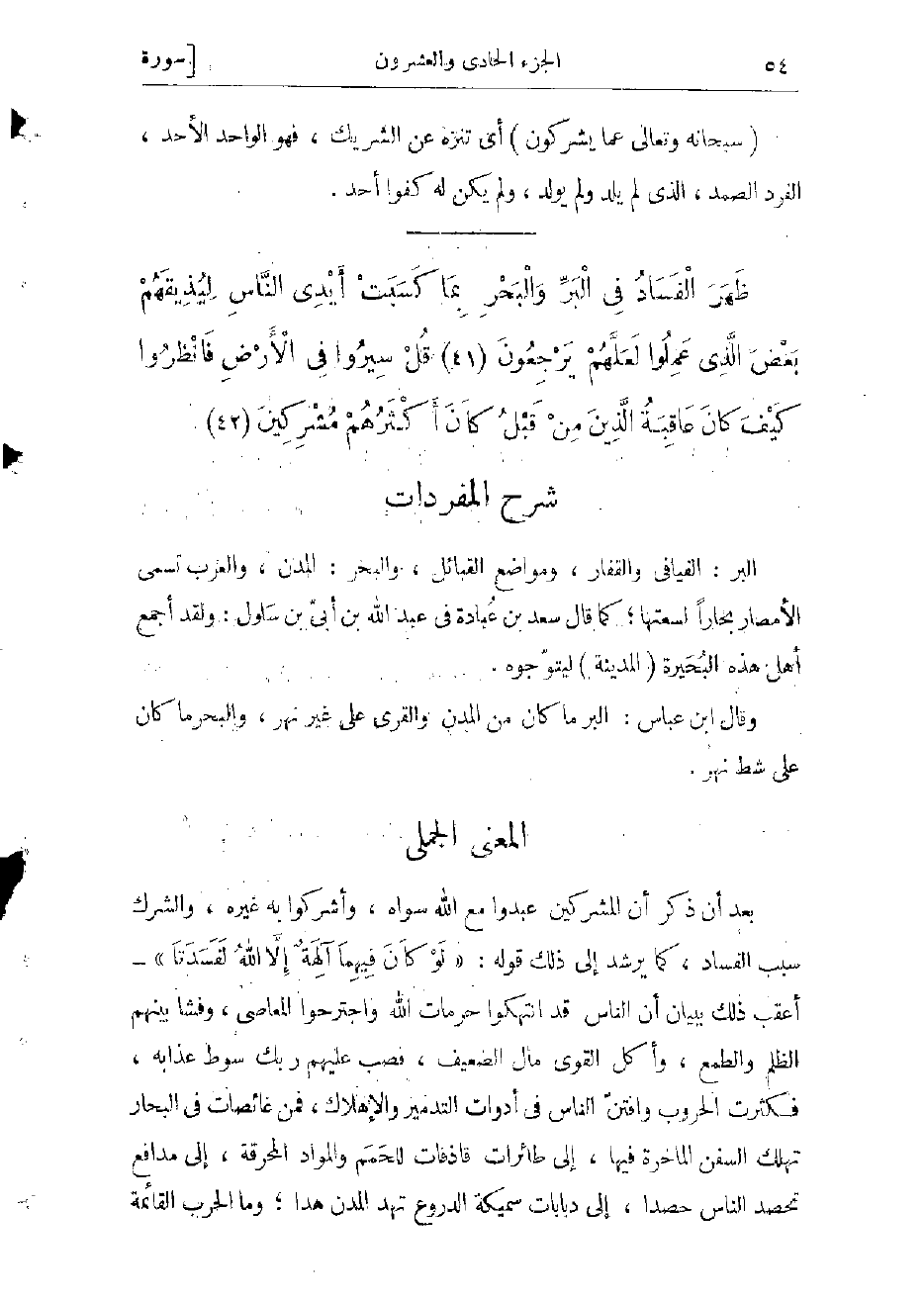 بعد أن ذكر أن المشركين عبدوا مع الله سواه، وأشركوا به غيره، والشرك سبب الفساد، كما يرشد إلى ذلك قوله: «لَوْ كانَ فِيهِما آلِهَةٌ إِلَّا اللَّهُ لَفَسَدَتا» - أعقب ذلك ببيان أن الناس قد انتهكوا حرمات الله، واجترحوا المعاصي، وفشا بينهم الظلم والطمع، وأكل القوى مال الضعيف، فصب عليهم ربهم سوط عذابه، فكثرت الحروب، وافتنّ الناس فى أدوات التدمير والإهلاك، فمن غائصات البحار تهلك السفن الماخرة فيها، إلى طائرات قاذفات للحمم والموادّ المحرقة، إلى مدافع تحصد الناس حصدا، إلى دبابات سميكة الدروع تهدّ المدن هدا وما الحرب القائمة