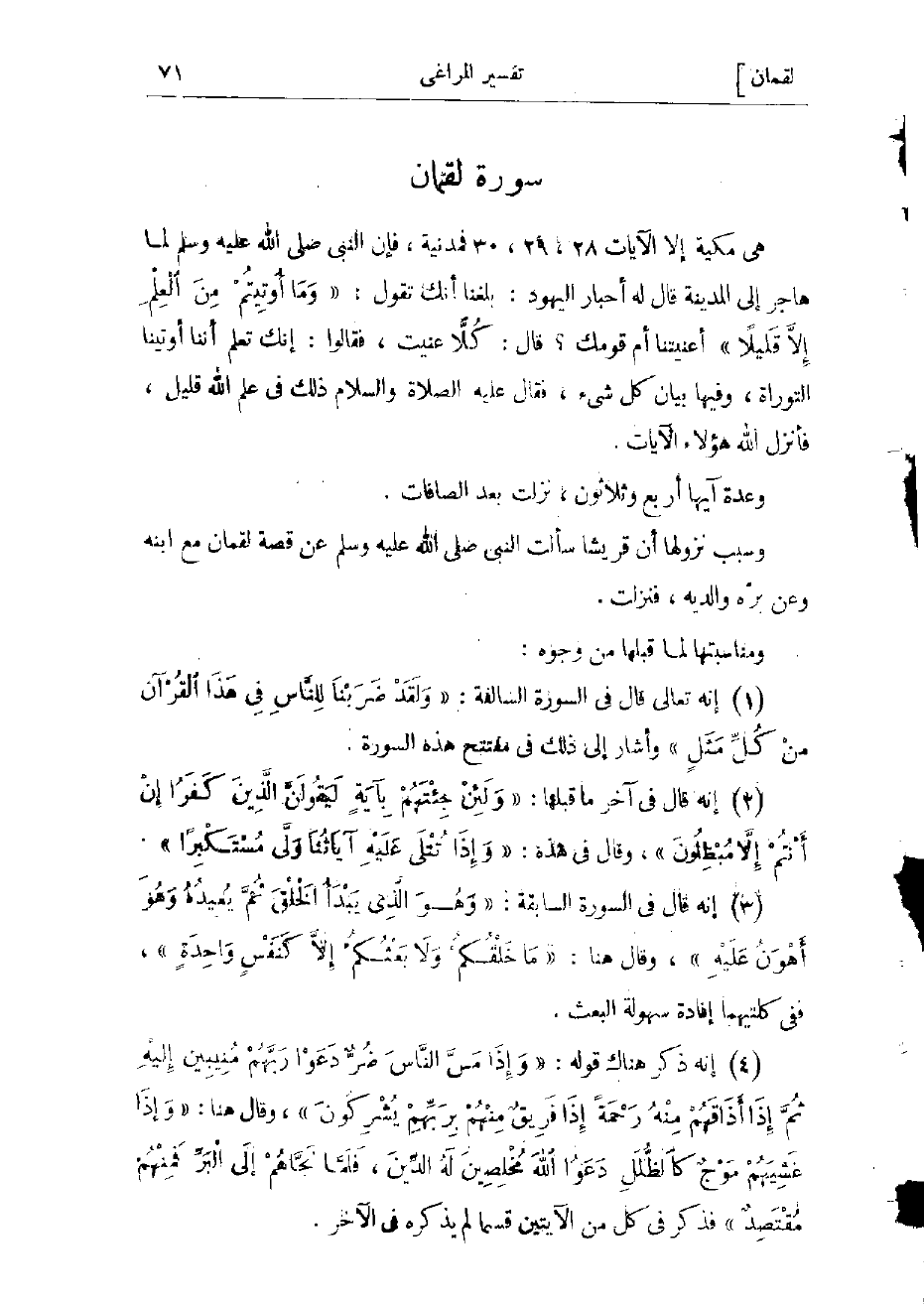 (4) إنه ذكر هناك قوله: «وَإِذا مَسَّ النَّاسَ ضُرٌّ دَعَوْا رَبَّهُمْ مُنِيبِينَ إِلَيْهِ ثُمَّ إِذا أَذاقَهُمْ مِنْهُ رَحْمَةً إِذا فَرِيقٌ مِنْهُمْ بِرَبِّهِمْ يُشْرِكُونَ» ، وقال هنا: «وَإِذا غَشِيَهُمْ مَوْجٌ كَالظُّلَلِ دَعَوُا اللَّهَ مُخْلِصِينَ لَهُ الدِّينَ، فَلَمَّا نَجَّاهُمْ إِلَى الْبَرِّ فَمِنْهُمْ مُقْتَصِدٌ» فذكر فى كل من الآيتين قسما لم يذكره فى الآخر.
