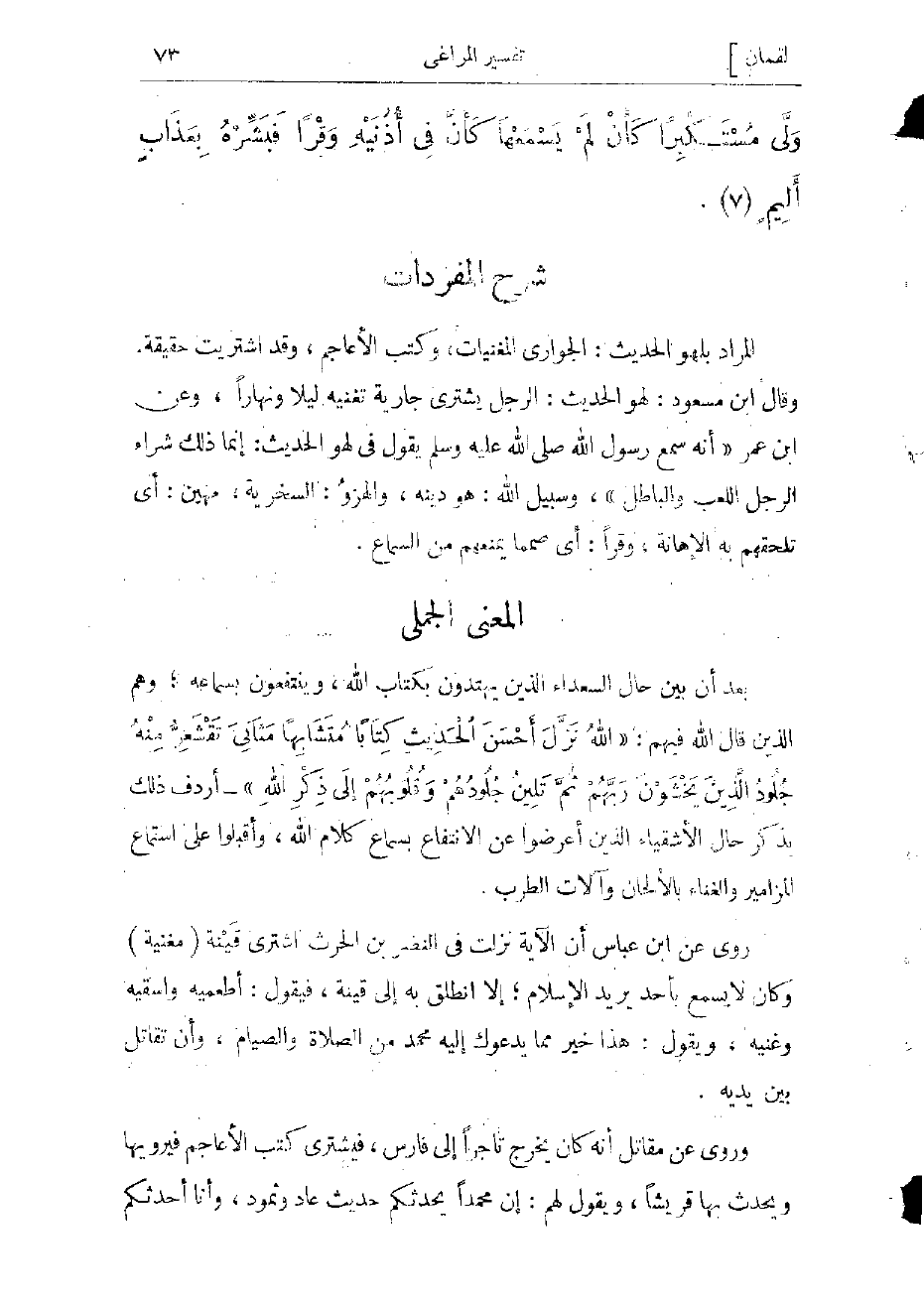 بعد أن بين حال السعداء الذين يهتدون بكتاب الله، وينتفعون بسماعه وهم الذين قال الله فيهم: «اللَّهُ نَزَّلَ أَحْسَنَ الْحَدِيثِ كِتاباً مُتَشابِهاً مَثانِيَ تَقْشَعِرُّ مِنْهُ جُلُودُ الَّذِينَ يَخْشَوْنَ رَبَّهُمْ ثُمَّ تَلِينُ جُلُودُهُمْ وَقُلُوبُهُمْ إِلى ذِكْرِ اللَّهِ» - أردف ذلك ذكر حال الأشقياء الذين أعرضوا عن الانتفاع بسماع كلام الله، وأقبلوا على استماع المزامير والغناء بالألحان وآلات الطرب.