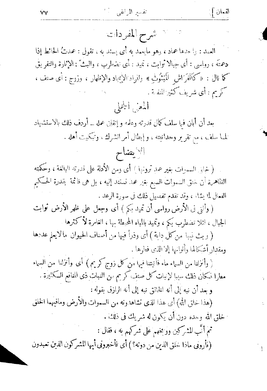 العمد: واحدها عماد، وهو ما يعمد به أي يسند به، تقول: عمدت الحائط إذا دعمته، رواسى: أي جبالا ثوابت، تميد: أي تضطرب، والبثّ: الإثارة والتفريق كما قال: «كَالْفَراشِ الْمَبْثُوثِ» والمراد الإيجاد والإظهار: وزوج: أي صنف، كريم:
