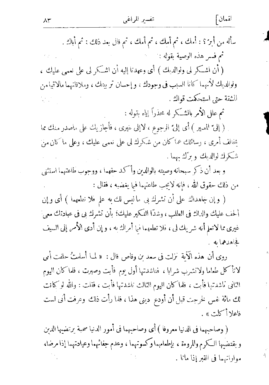 روى أن هذه الآية نزلت فى سعد بن أبى وقاص قال: «لما أسلمت حلفت أمي لا تأكل طعاما ولا تشرب شرابا، فناشدتها أول يوم فأبت وصبرت، فلما كان اليوم الثاني ناشدتها فأبت، فلما كان اليوم الثالث ناشدتها فأبت، فقلت: والله لو كانت لك مائة نفس لخرجت قبل أن أودع دينى هذا، فلما رأت ذلك وعرفت أنى لست فاعلا أكلت» .