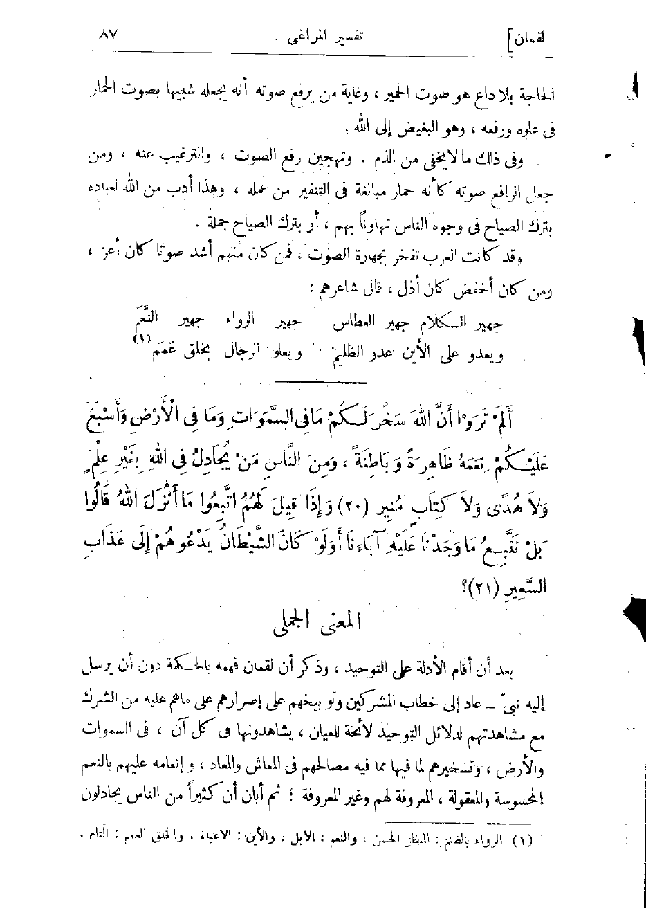 بعد أن أقام الأدلة على التوحيد، وذكر أن لقمان فهمه بالحكمة دون أن يرسل إليه نبىّ- عاد إلى خطاب المشركين وتوبيخهم على إصرارهم على ما هم عليه من الشرك مع مشاهدتهم لدلائل التوحيد لائحة للعيان، يشاهدونها فى كل آن، فى السموات والأرض، وتسخيرهم لما فيها مما فيه مصالحهم فى المعاش والمعاد، وإنعامه عليهم بالنعم المحسوسة والمعقولة، المعروفة لهم وغير المعروفة ثم أبان أن كثيرا من الناس يجادلون