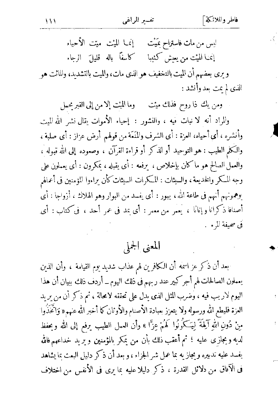 بعد أن ذكر عز اسمه أن الكافرين لهم عذاب شديد يوم القيامة، وأن الذين يعملون الصالحات لهم أجر كبير عند ربهم في ذلك اليوم- أردف ذلك بيان أن هذا اليوم لا ريب فيه، وضرب المثل الذي يدل على تحققه لا محالة، ثم ذكر أن من يريد العزة فليطع الله ورسوله، ولا يتعزز بعبادة الأصنام والأوثان كما أخبر الله عنهم «وَاتَّخَذُوا مِنْ دُونِ اللَّهِ آلِهَةً لِيَكُونُوا لَهُمْ عِزًّا» وأن العمل الطيب يرفع إلى الله ويحفظ لديه ويجازى. عليه، ثم أعقب ذلك بأن من يمكر بالمؤمنين ويريد خداعهم فالله يفسد عليه تدبيره ويجازيه بما عمل شر الجزاء، وبعد أن ذكر دليل البعث بما يشاهد فى الآفاق من دلائل القدرة، ذكر دليلا عليه بما يرى في الأنفس من اختلاف
