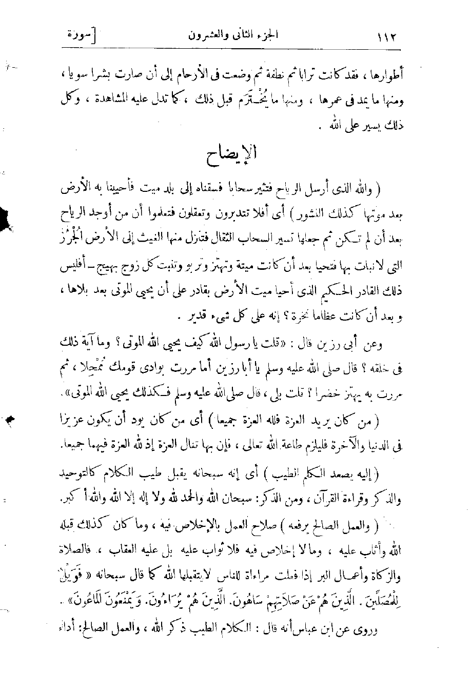 (وَاللَّهُ الَّذِي أَرْسَلَ الرِّياحَ فَتُثِيرُ سَحاباً فَسُقْناهُ إِلى بَلَدٍ مَيِّتٍ فَأَحْيَيْنا بِهِ الْأَرْضَ بَعْدَ مَوْتِها كَذلِكَ النُّشُورُ) أي أفلا تتدبرون وتعقلون فتعلموا أن من أوجد الرياح بعد أن لم تكن، ثم جعلها تسيّر السحاب الثقال، فتنزل منها الغيث إلى الأرض الجرز التي لا نبات بها، فتحيا بعد أن كانت ميتة وتهتز وتربو وتنبت كل زوج بهيج- أفليس ذلك القادر الحكيم الذي أحيا ميت الأرض بقادر على أن يحيى الموتى بعد بلاها، وبعد أن كانت عظاما نخرة؟ إنه على كل شىء قدير.