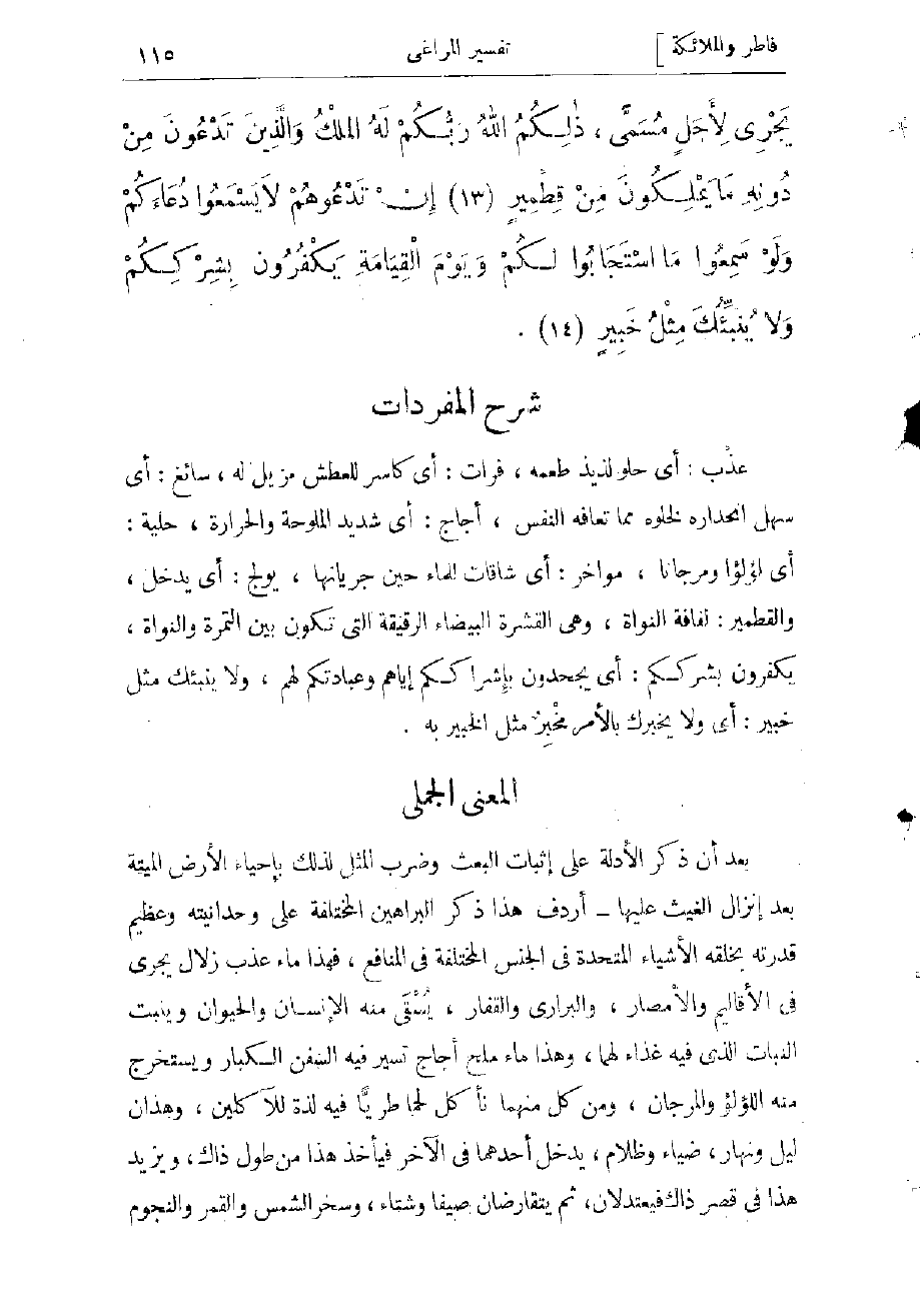 عذب: أي حلو لذيذ طعمه، فرات: أي كاسر للعطش مزيل له، سائغ: أي سهل انحداره لخلوه مما تعافه النفس، أجاج: أي شديد الملوحة والحرارة، حلية: أي لؤلؤا ومرجانا، مواخر: أي شاقات للماء حين جريانها، يولج: أي يدخل، والقطمير: لفافة النبواة، وهى القشرة البيضاء الرقيقة التي تكون بين التمرة والنواة، يكفرون بشرككم: