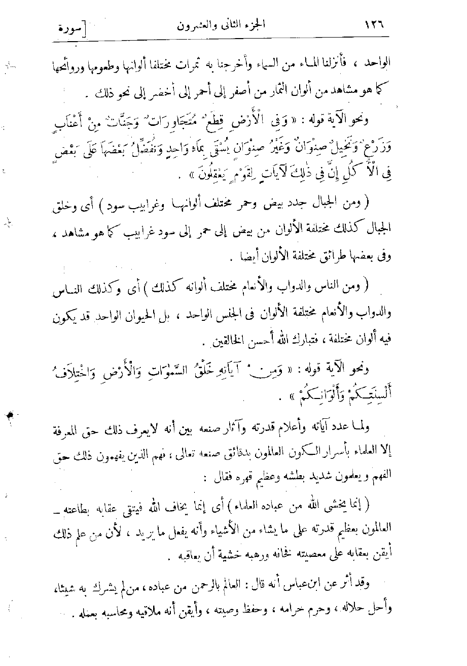 (وَمِنَ النَّاسِ وَالدَّوَابِّ وَالْأَنْعامِ مُخْتَلِفٌ أَلْوانُهُ كَذلِكَ) أي وكذلك الناس والدواب والأنعام مختلفة الألوان في الجنس الواحد، بل الحيوان الواحد قد يكون فيه ألوان مختلفة، فتبارك الله أحسن الخالقين.