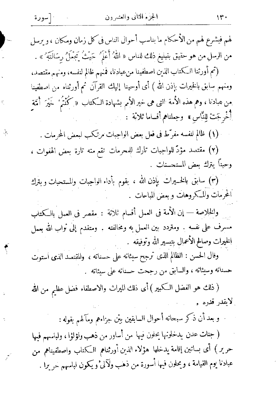والخلاصة- إن الأمة في العمل أقسام ثلاثة: مقصّر في العمل بالكتاب مسرف على نفسه. ومتردد بين العمل به ومخالفته. ومتقدم إلى ثواب الله بعمل الخيرات وصالح الأعمال بتيسير الله وتوفيقه.