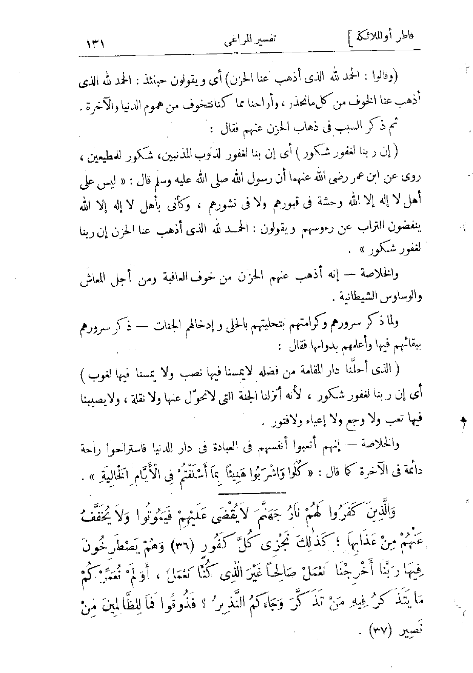 (وَقالُوا الْحَمْدُ لِلَّهِ الَّذِي أَذْهَبَ عَنَّا الْحَزَنَ) أي ويقولون حينئذ: الحمد لله الذي أذهب عنا الخوف من كل ما نحذر، وأراحنا مما كنا نتخوف من هموم الدنيا والآخرة.