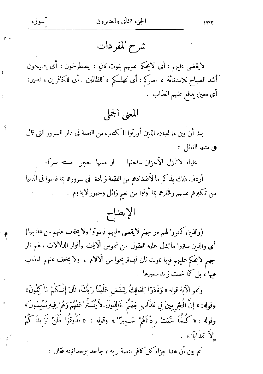 ونحو الآية قوله: «وَنادَوْا يا مالِكُ لِيَقْضِ عَلَيْنا رَبُّكَ، قالَ إِنَّكُمْ ماكِثُونَ» وقوله: «إِنَّ الْمُجْرِمِينَ فِي عَذابِ جَهَنَّمَ خالِدُونَ. لا يُفَتَّرُ عَنْهُمْ وَهُمْ فِيهِ مُبْلِسُونَ» وقوله: «كُلَّما خَبَتْ زِدْناهُمْ سَعِيراً» وقوله: «فَذُوقُوا فَلَنْ نَزِيدَكُمْ إِلَّا عَذاباً» .