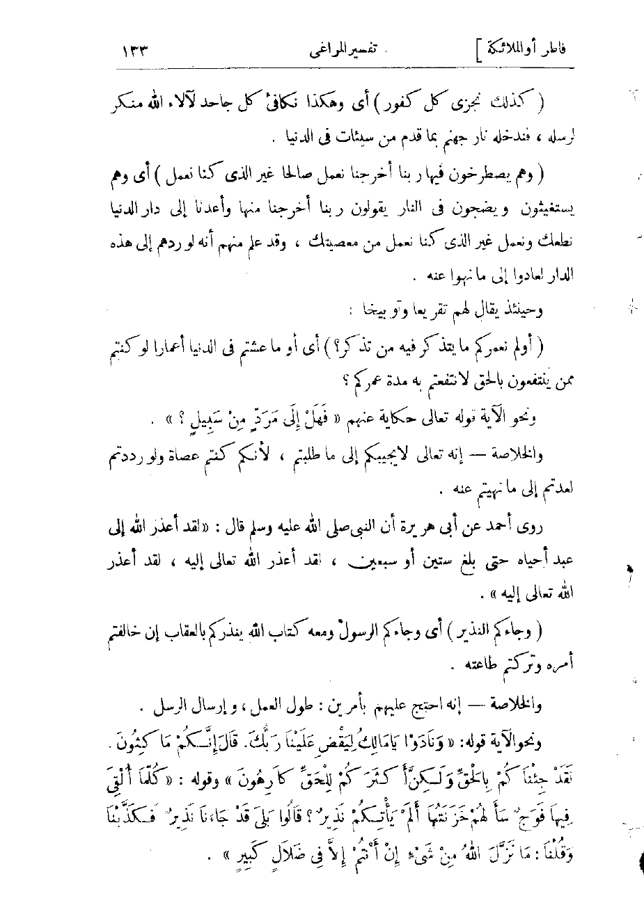 والخلاصة- إنه احتج عليهم بأمرين: طول الأمل، وإرسال الرسل ونحو الآية قوله: «وَنادَوْا يا مالِكُ لِيَقْضِ عَلَيْنا رَبُّكَ، قالَ إِنَّكُمْ ماكِثُونَ. لَقَدْ جِئْناكُمْ بِالْحَقِّ وَلكِنَّ أَكْثَرَكُمْ لِلْحَقِّ كارِهُونَ» وقوله: «كُلَّما أُلْقِيَ فِيها فَوْجٌ سَأَلَهُمْ خَزَنَتُها أَلَمْ يَأْتِكُمْ نَذِيرٌ؟ قالُوا بَلى قَدْ جاءَنا نَذِيرٌ فَكَذَّبْنا وَقُلْنا: ما نَزَّلَ اللَّهُ مِنْ شَيْءٍ إِنْ أَنْتُمْ إِلَّا فِي ضَلالٍ كَبِيرٍ» .
