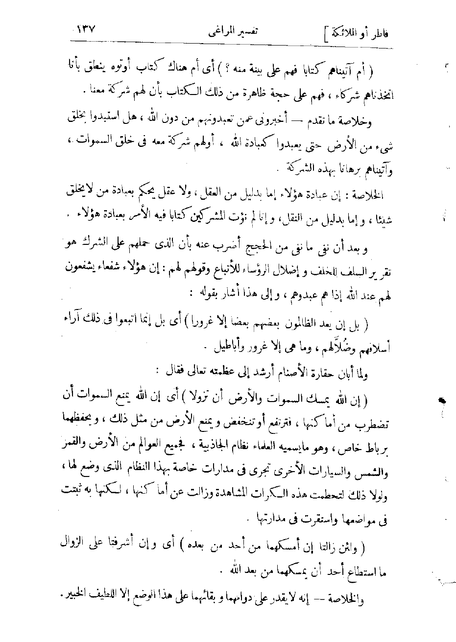 (إِنَّ اللَّهَ يُمْسِكُ السَّماواتِ وَالْأَرْضَ أَنْ تَزُولا) أي إن الله يمنع السموات أن تضطرب من أماكنها، فترتفع أو تنخفض ويمنع الأرض من مثل ذلك، ويحفظهما برباط خاص، وهو ما يسميه العلماء نظام الجاذبية، فجميع العوالم من الأرض والقمر والشمس والسيارات الأخرى تجرى في مدارات خاصة بهذا النظام الذي وضع لها، ولولا ذلك لتحطمت هذه الكرات المشاهدة، وزالت عن أماكنها، لكنها به ثبتت فى مواضعها، واستقرت في مداراتها.