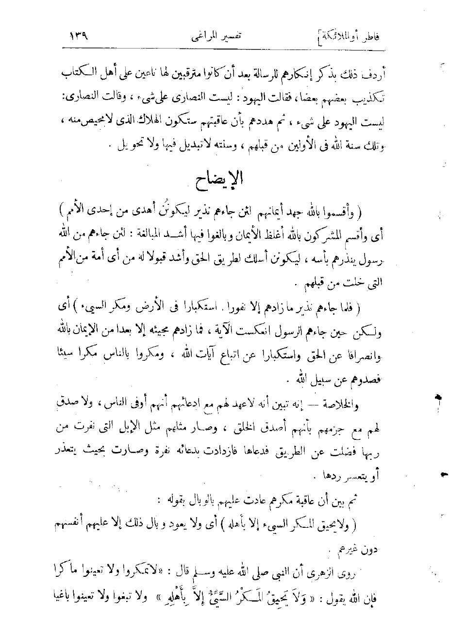 (فَلَمَّا جاءَهُمْ نَذِيرٌ ما زادَهُمْ إِلَّا نُفُوراً. اسْتِكْباراً فِي الْأَرْضِ وَمَكْرَ السَّيِّئِ) أي ولكن حين جاءهم الرسول انعكست الآية، فما زادهم مجيئه إلا بعدا من الإيمان بالله، وانصرافا عن الحق، واستكبارا عن اتباع آياته، ومكروا بالناس مكرا سيئا فصدوهم عن سبيله.